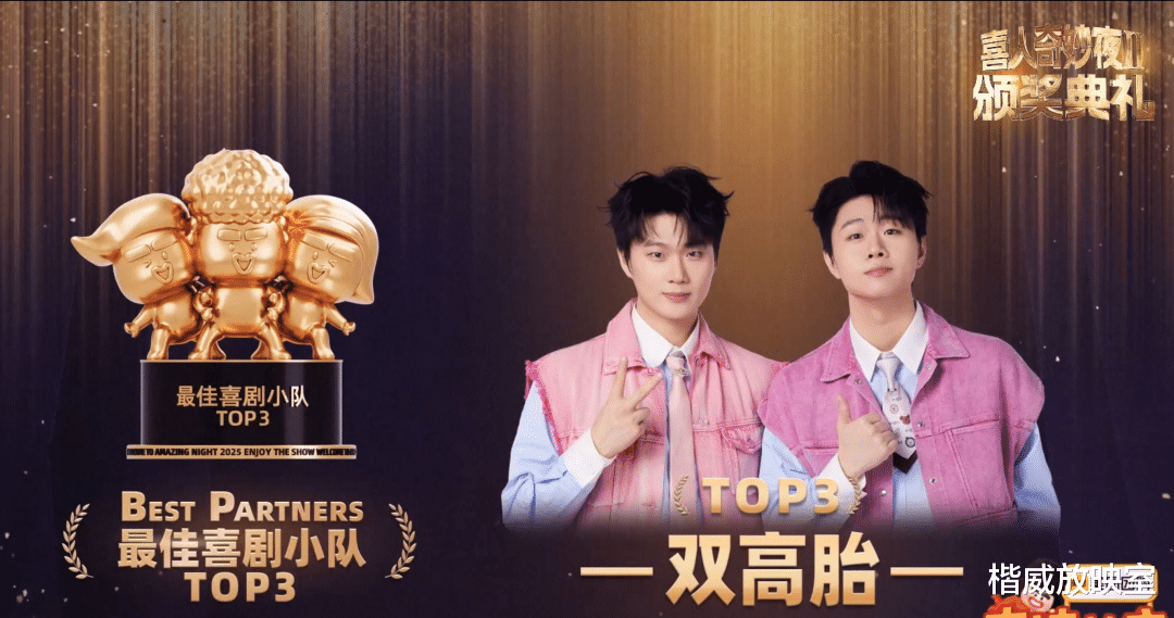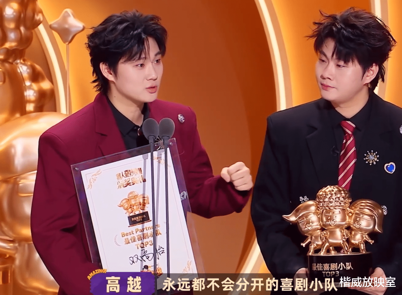 第三名是同样去年也获得了这个奖项的双高胎组合。兄弟俩还是高越更加活跃,哥哥高超哽咽到说不下去,还是高越发表获奖感言,别人都认为双胞胎的喜剧有局限性,但他们在本季的创排恰恰证明了这是他们的优势。高越说他们可以升番到100岁,而且他们也是永远不会分开的喜剧小队,这一点的确令人羡慕,没有哪个喜人小队的默契度能和一个双胞胎组合相比。