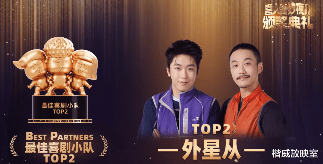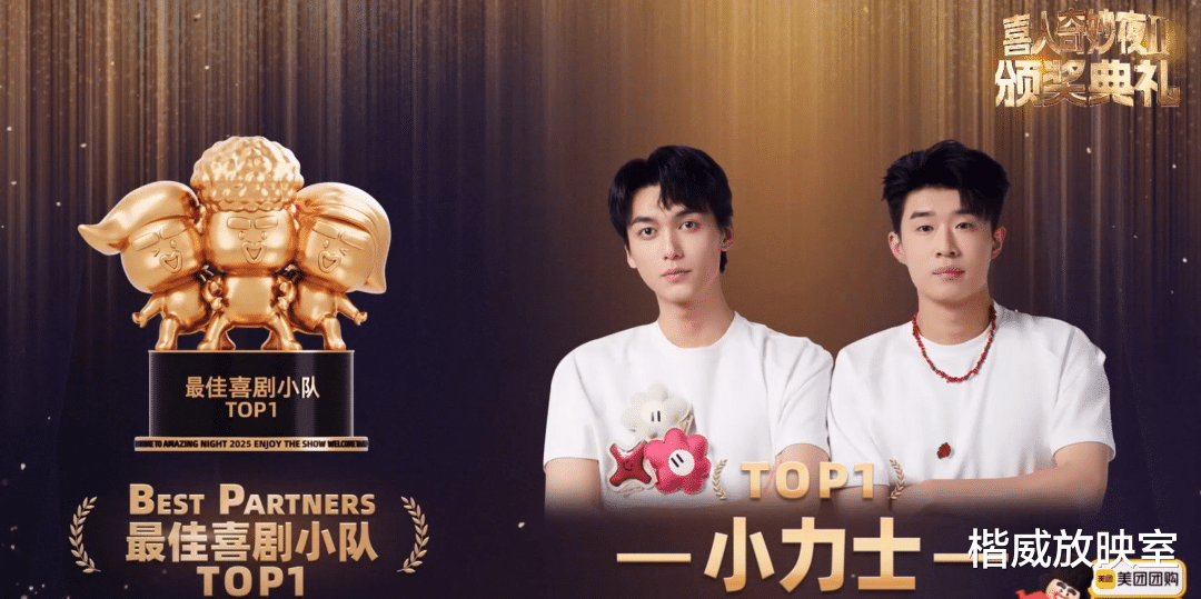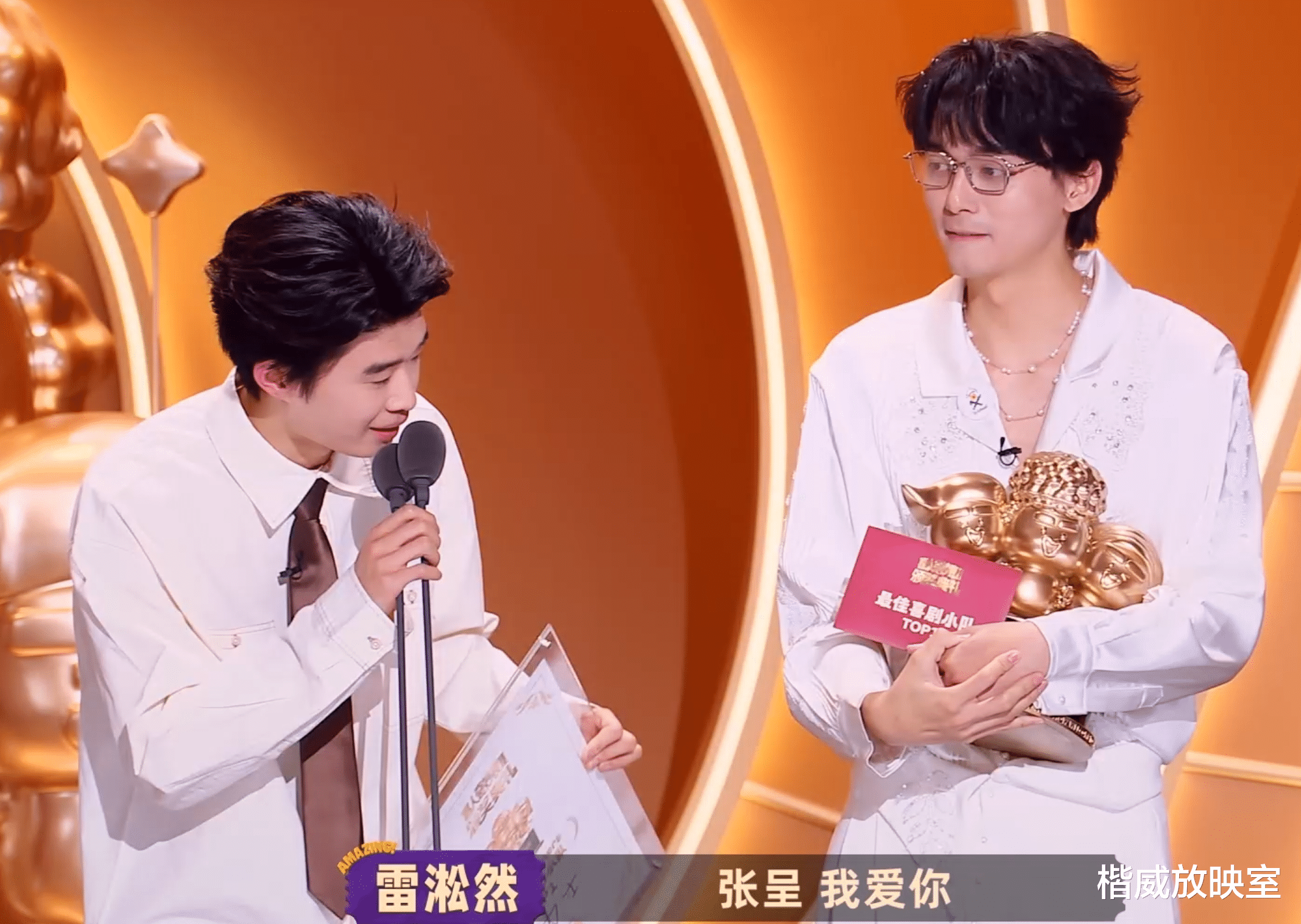 而top小队第一名,也同样不意外,是小力士组合的张呈和雷淞然。这一季他们的表现也是非常突出的,在之前的文章里就多次提到,我身边凡是看过节目的朋友,大多数都对他们俩的进步有直观层面的感受。这次发表获奖感言时,张呈显然是更加激动的,虽然今天已经不是第一次登上领奖台,而这个喜剧小队top1的奖,是对他没有放弃而继续坚持来这档节目的见证与肯定。