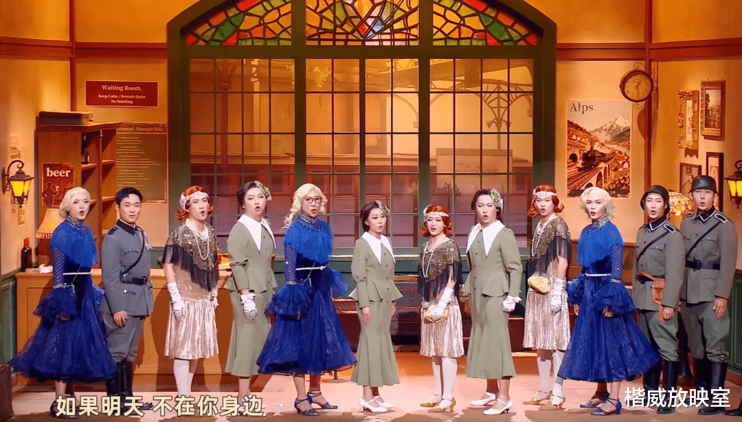 接下来上场的喜团是OK BOOM!于奥和铁男这对夫妇的确是迷恋二战题材,这次的毕业大戏《再见,噶尔波》也是这个熟悉的调性,噶尔波其实原型是美国影星葛丽泰·嘉宝。而这个作品最直观的特点就是三组人乔装打扮,每组三个男性角色,九个男演员,都是全员女装出现,自带喜感,左凌峰这一季已经不是第一次反串出演了。
