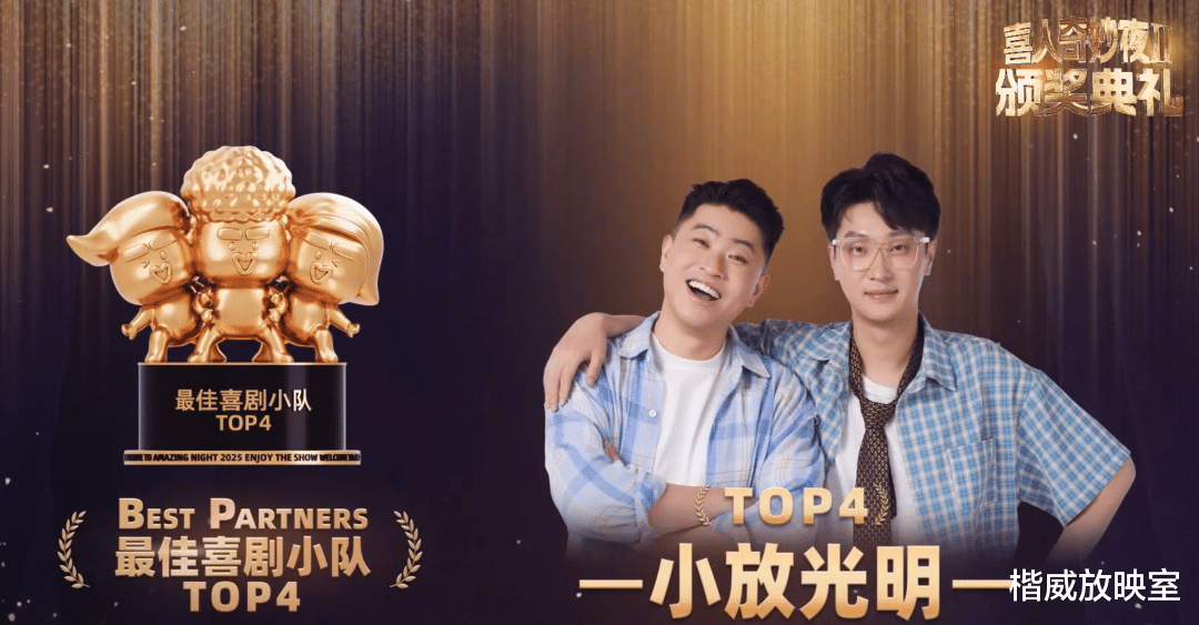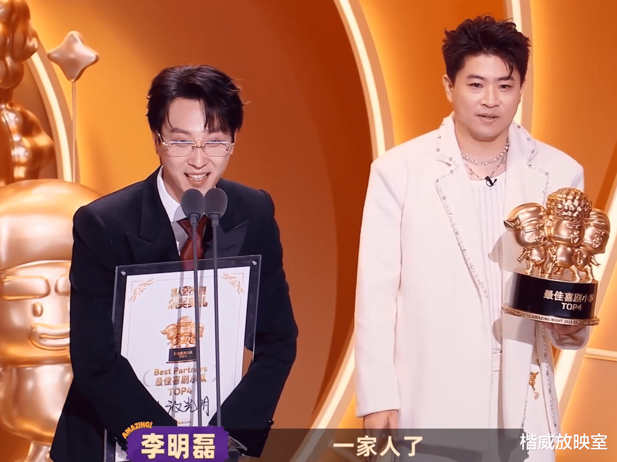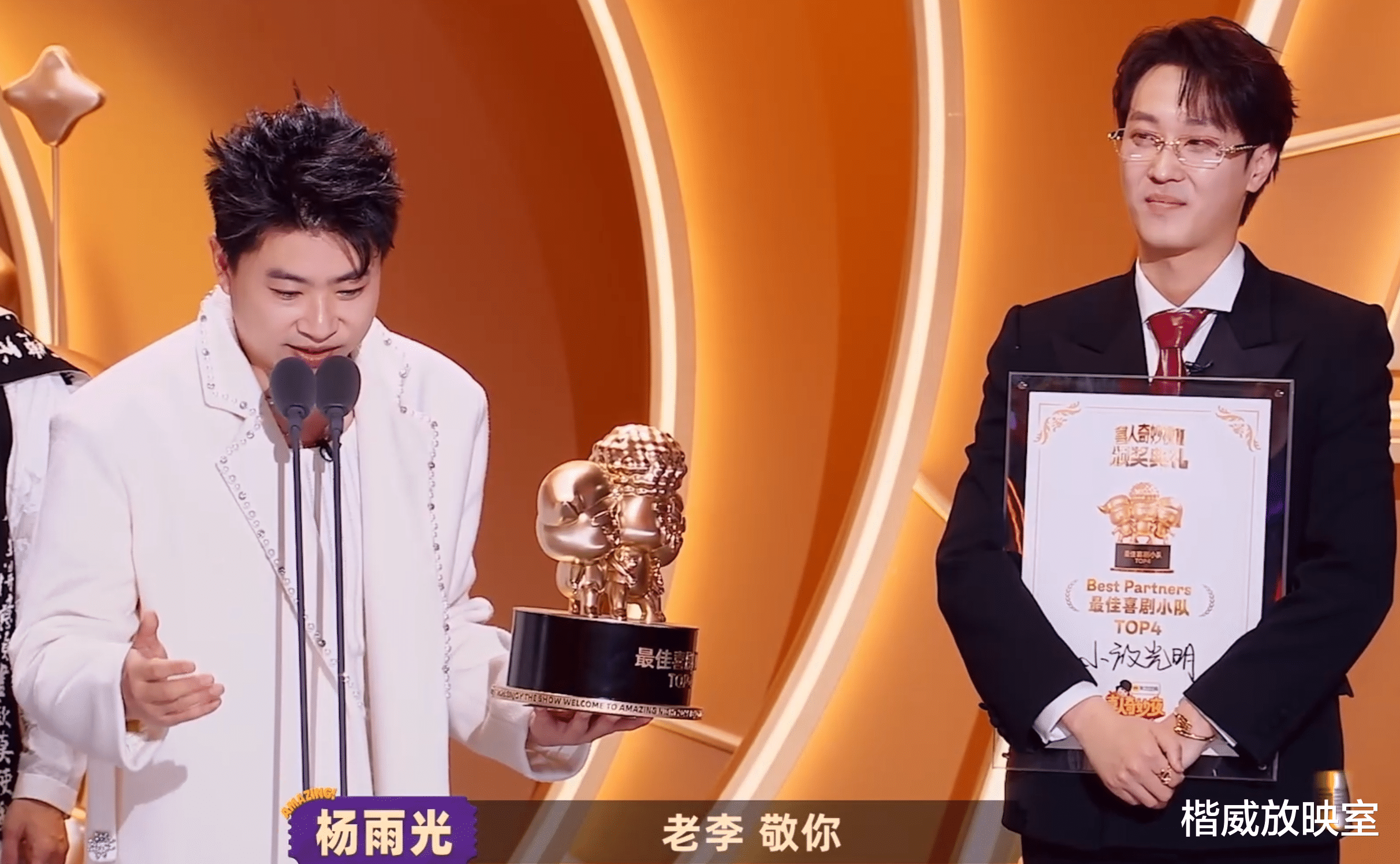 第四名是“小放光明”,杨雨光在得到行业瞩目喜人之后,再次上台,没有在喜剧大会里绽放的李明磊,也终于通过这档节目让更多人认识了他。这两人的获奖感言,也让人好磕,“叔婶”互相“表白”可以说是本季颁奖环节里的名场面。一个说“老李,敬你”,一个说把对方当成一家人了。