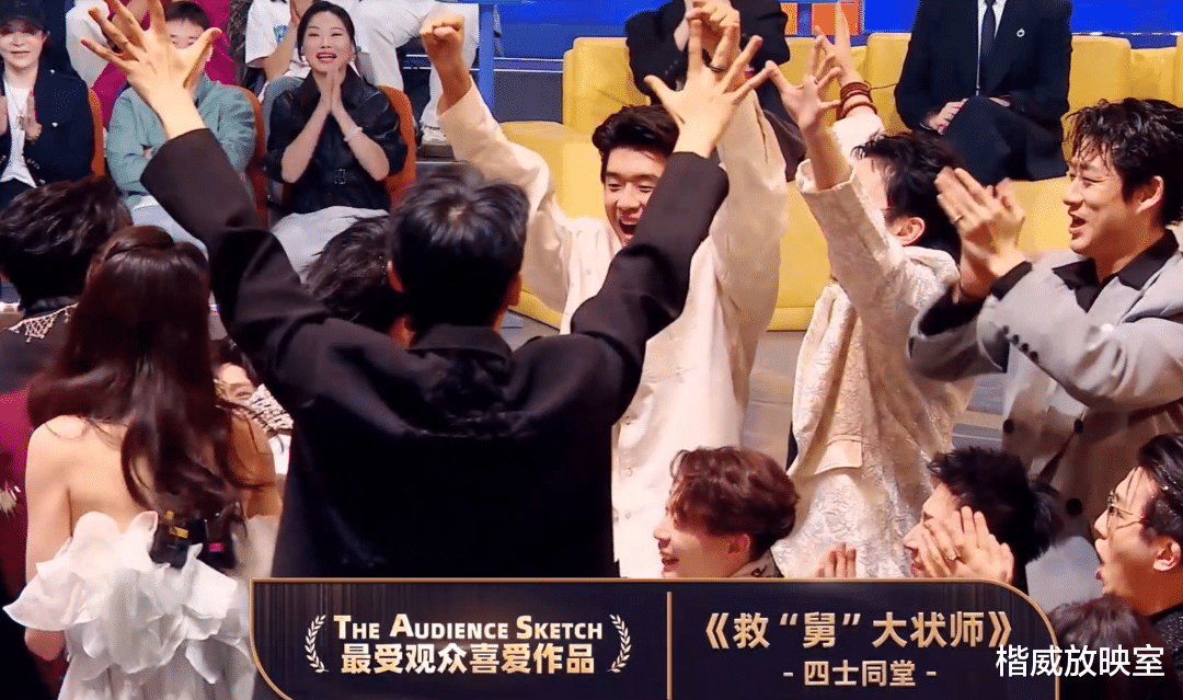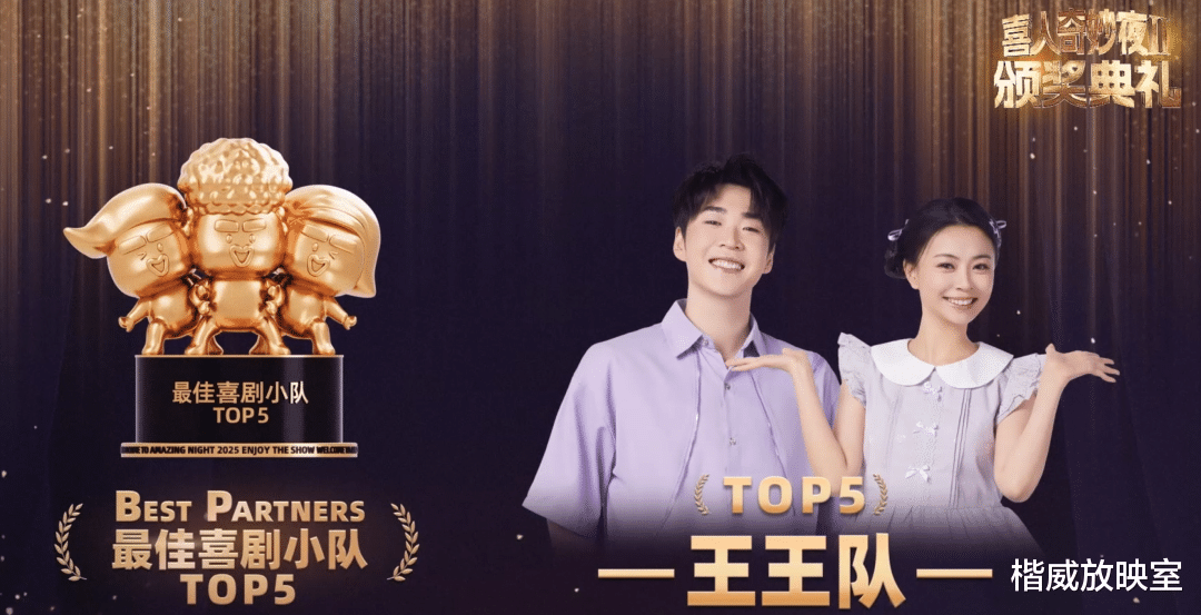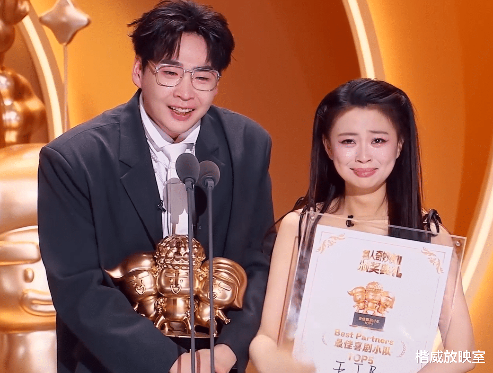接下来的奖项就更加重量级,最佳喜剧小队TOP5。第五名是王王队,一组哭得最凶的组合,王男和王广,两人上台都哭得不行,基本上说不下去。的确也能理解,毕竟本季他们最初的成绩并不理想,而且王男最初来喜人节目也是单打独斗,淘汰后成为助演,看到的是她喜剧表演,而没能展现她的编剧才华。他们能获奖,土豆也跟着喜极而泣,嘉宾里,徐峥和马东也都在拭泪。