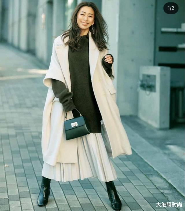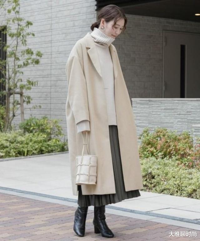 温柔高级的日常风格,浅米色宽松具有流动感长款大衣,内搭同色系高领毛衣,同色系叠穿营造出柔和统一的氛围;深灰色百褶长裙,柔和的深色与浅色系上装形成低饱和度撞色,既增加了层次感,又不会显得突兀。