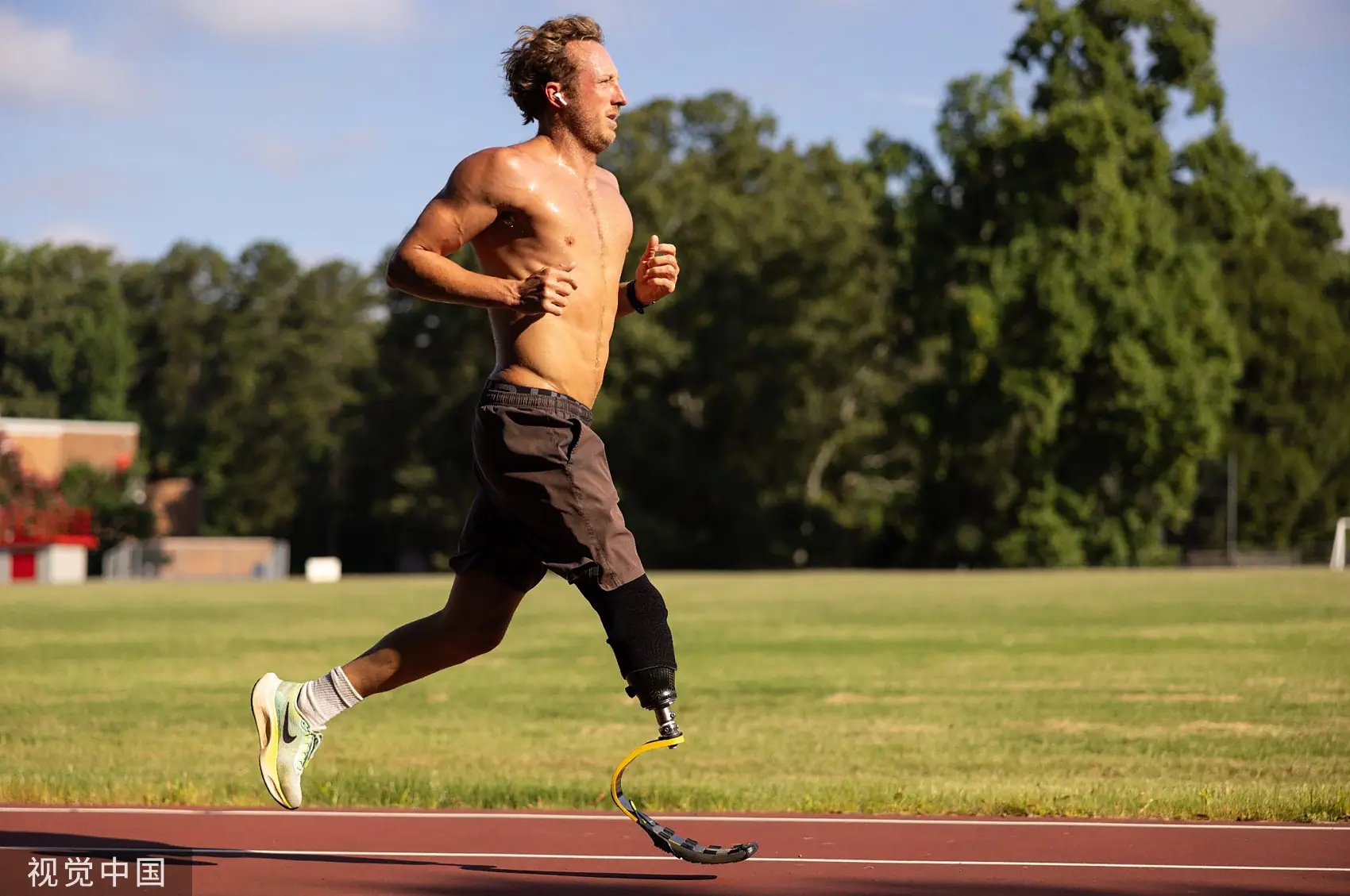 当地时间2024年7月6日,美国北卡罗来纳州,卡森·克拉夫在北卡罗来纳州夏洛特的亚历山大·格雷厄姆中学为残奥会铁人三项训