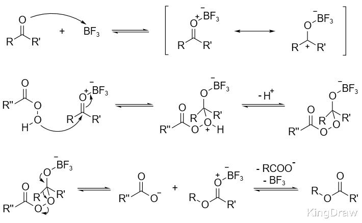 首先,反应物的羰基被质子活化,从而易于接受过氧酸的亲核进攻。亲核加成的产物中带有一个氧鎓离子,其质子将较容易转移到邻近的氧原子上,并通过正电荷与羰基共轭而获得额外的稳定性。随后,与原来过氧酸对应的羧酸从中间体离去,留下一个缺电子的氧正离子。由于氧具有很高的电负性,缺电子的氧是不稳定的,一个烃基就通过1,2-迁移反应使整个分子再度符合八隅律规则,得到一个质子化的酯,并很快脱去质子而得到最终产物。通常认为羧酸的离去与烃基的迁移是同时进行,相互促进的。