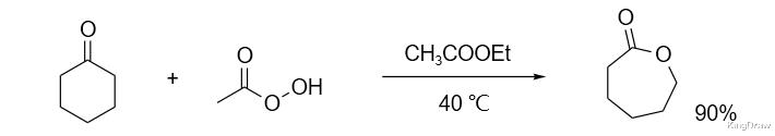 Baeyer-Villiger 氧化,是酮在过氧化物(如过氧化氢、过氧化羧酸等)氧化下,在羰基和一个邻近烃基之间引入一个氧原子,得到相应的酯的化学反应。醛可以进行同样的反应,氧化的产物是相应的羧酸。反应中迁移基团的立体化学保持不变,并且反应具有一定的区域选择性,因此它在有机合成中对官能团转化和环扩张有重要意义。