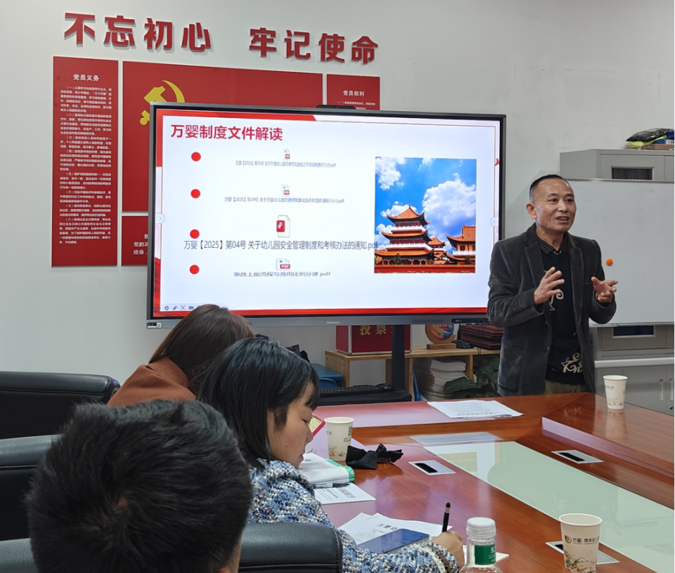 自1998年起,万婴幼儿园将每月25日定为安全教育日,每月20日定为师德师风警示日,全年累计组织开展相关培训教育活动超100次。2025年,幼儿园持续强化师风建设与安全管理:分别于1月、9月,先后出台《师德师风底线工作细则》与《安全事故追责管理制度》,同步公示师德师风监督举报平台,全面接受家长、教职工及社会各界监督,切实筑牢校园安全责任防线;4月、10月分别召开安全工作专题会议,组织各园教学主任、后勤安全主任及相关负责人参会,围绕师德师风建设、安全制度优化、突出问题整改、重点工作部署四大核心议题展开深入研讨,进一步明确工作举措、压实管理责任。