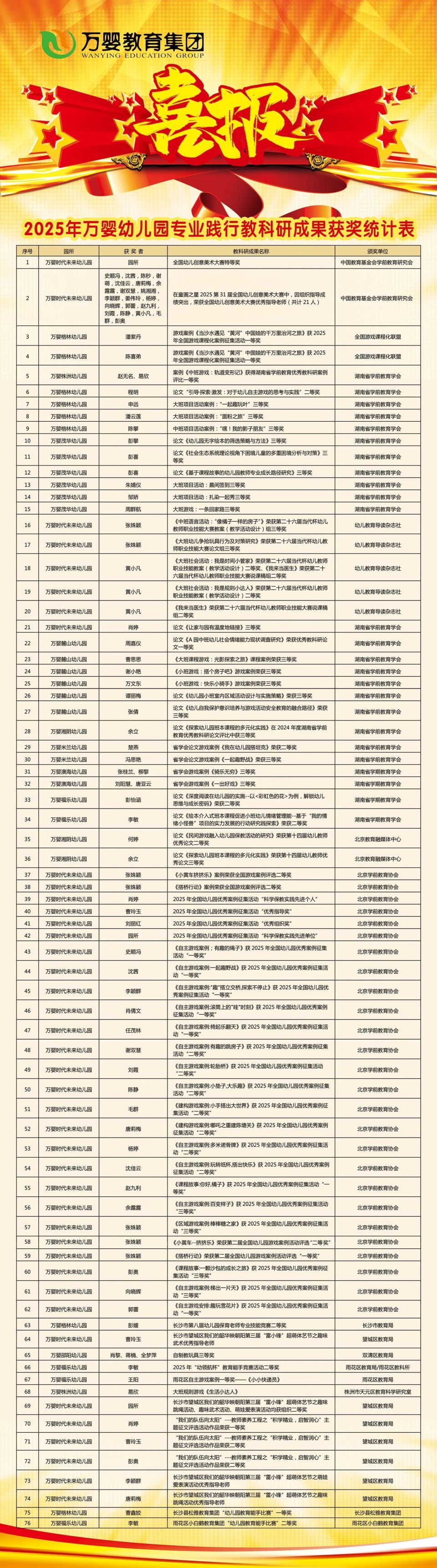 这一年,我们在专业领域不断深耕。全年共推进8 项课题工作,覆盖株洲、格林、茂华、麓山 4 个园所,以扎实的实践探索为学前教育发展注入动力。论文与案例评选中,全年累计斩获76项奖项,获奖园所遍及株洲、格林、茂华、时代未来、邵阳、麓山、湘阴、米兰、澳海、福乐 10 个园所,用硬核实力书写专业成长答卷。