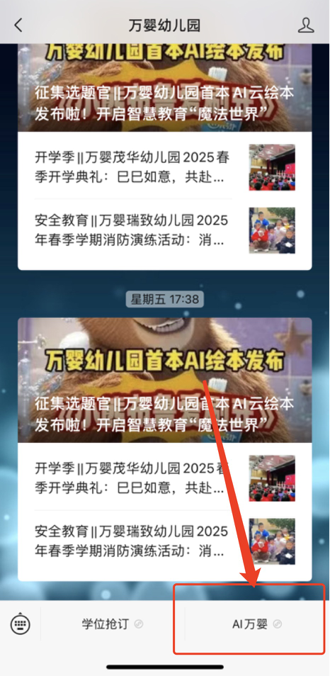 拥抱创新,让育儿更高效。2025年,万婴官微重磅升级——率先接入国民AI DeepSeek智能体,成为湖南学前教育领域首批“AI赋能”的园所!从此,AI化身家园沟通的智能桥梁,精准回应家长的育儿困惑;变身科学育儿的专业伙伴,提供个性化育儿建议,全方位升级育娃体验,用科技为幼教注入新活力。