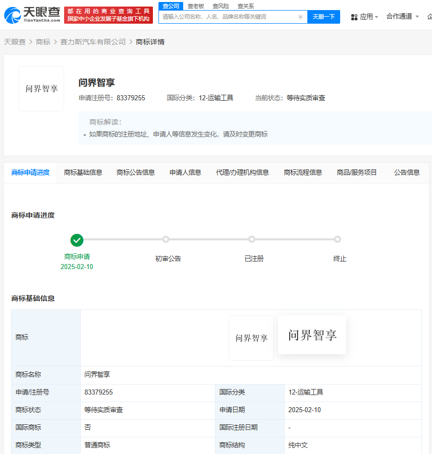 天眼查知识产权信息显示,近日,赛力斯汽车有限公司申请注册多枚问界智享商标,国际分类涉及运输工具、教育娱乐、金融物管等,当前商标状态均为等待实质审查。