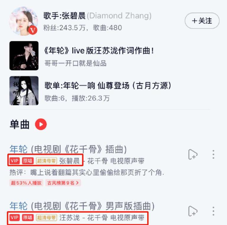 QQ音乐已经悄悄把张碧晨的《年轮》标注从“原唱”改成了“双原唱”,而汪苏泷那边依然写着“原唱”。网易云、酷狗也都在做调整。