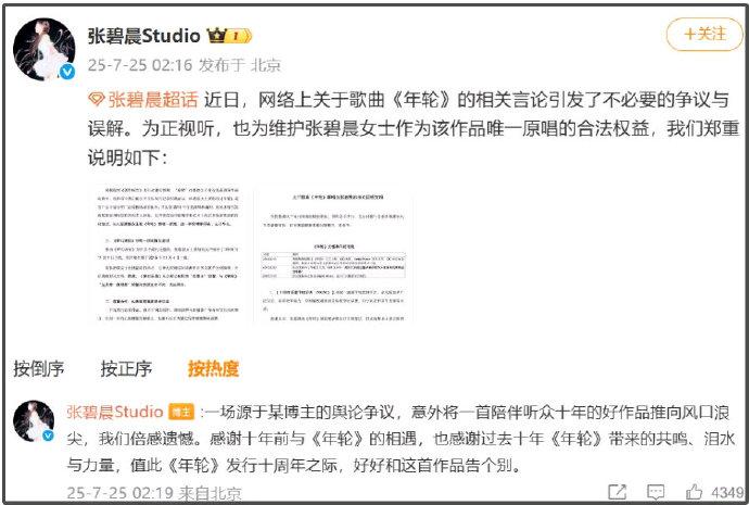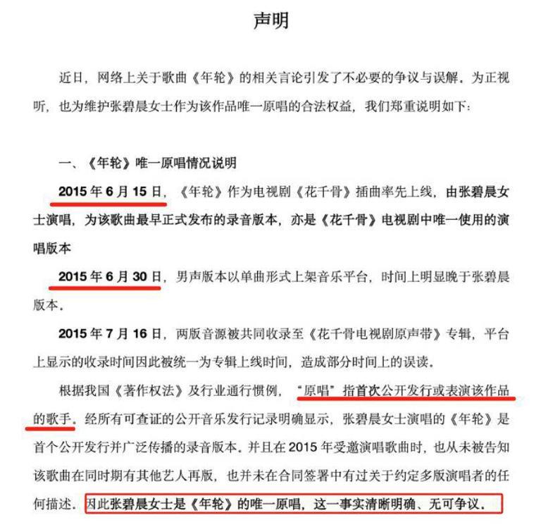 25日晚张碧晨工作室再度发文,称张碧晨依法享有该歌曲在全球范围内永久演唱的权利,出于尊重与自我选择,张碧晨女士今后将不再演唱该歌曲。