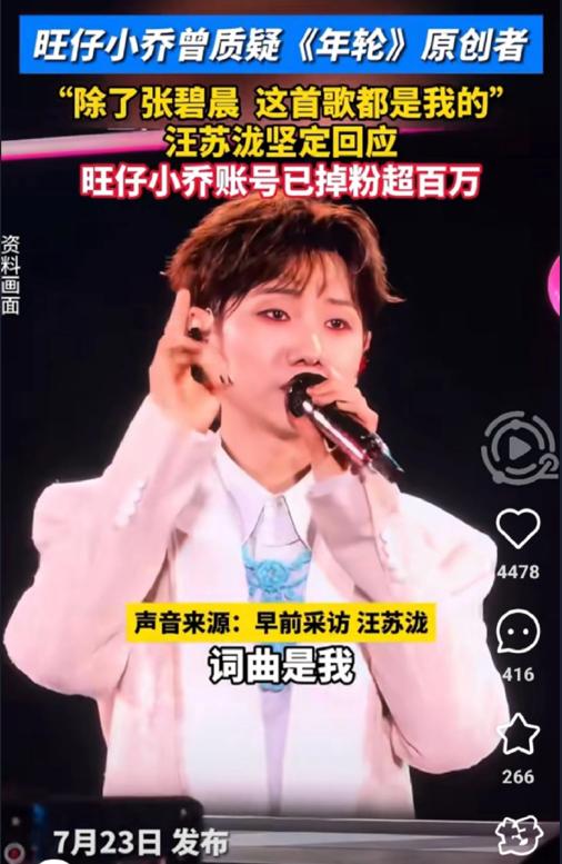 更讽刺的是,这场风波的起点,竟然是一个网红在直播间的几句话。旺仔小乔,一位靠翻唱起家的博主,在翻唱《年轮》时一口咬定:“《年轮》由汪苏泷创作,但原唱是张碧晨,我认定的事不会改“。