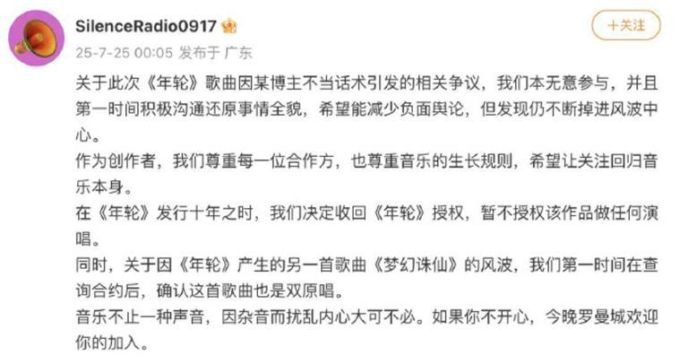 7月25日凌晨,汪苏泷团队突然发声,宣布全面收回《年轮》的演唱授权,不再允许任何人演唱这首歌。
