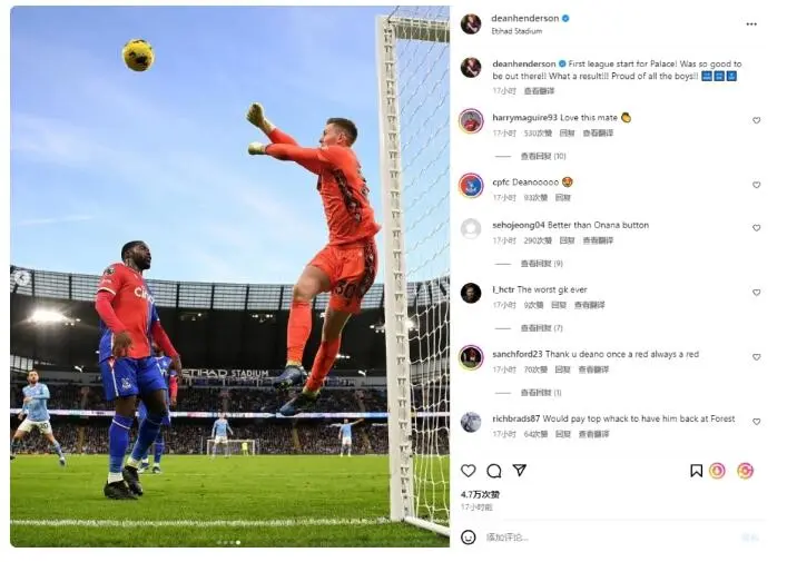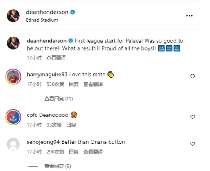 幸运的是,大多数球迷看到这个评论后表达了自己的不满与愤怒。其中一位球迷回复道:“比奥纳纳更好点赞”,这句简短的回复立刻得到了290个赞。这不仅是对亨德森的支持,也彰显出水晶宫球迷对亨德森的认可与喜爱。毕竟,亨德森在曼联期间展现了出色的实力和潜力,此次加盟水晶宫也是为了能够继续在英超联赛中证明自己。