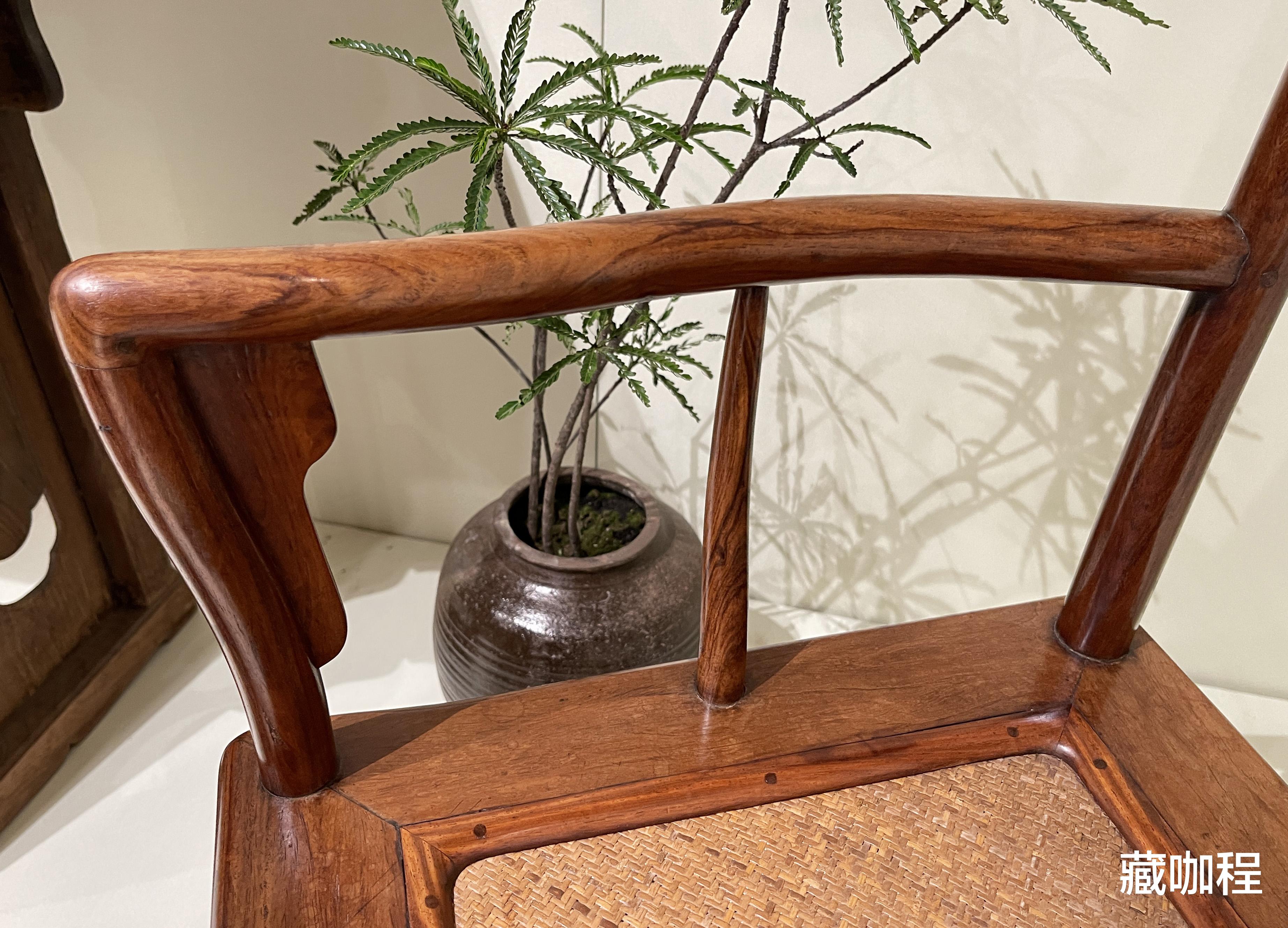 搭脑中部拱出枕形,表面微凹以贴合后脑,两边和缓上扬留料造挖烟袋锅榫,端头见棱见角。