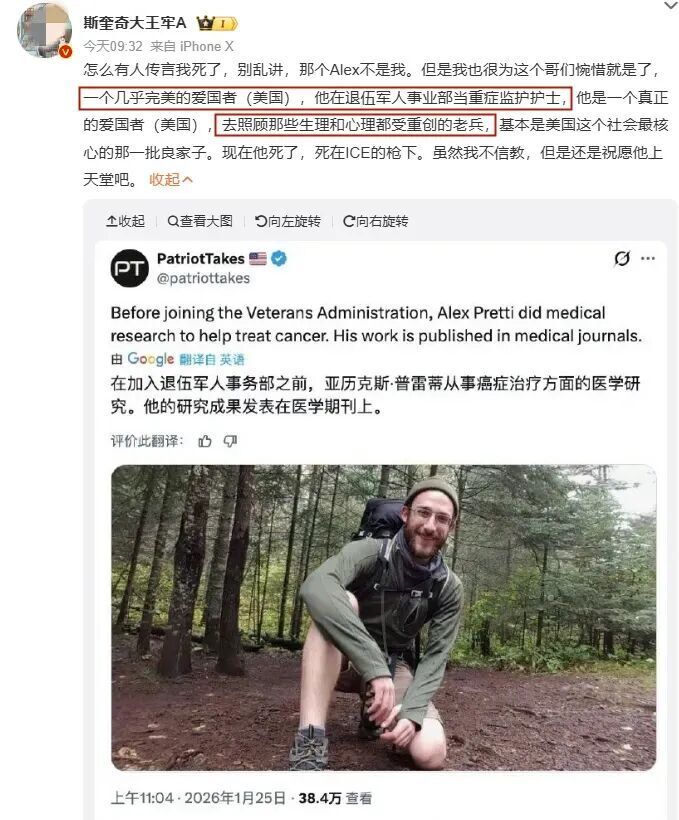 最近,美国移民局(ICE)真是“杀疯了”,不仅抓非法移民,连“正白旗”的美国公民都干掉了。这次被干掉的人也叫Alex,跟牢A一样有医学背景,平时也爱热心帮助他人。