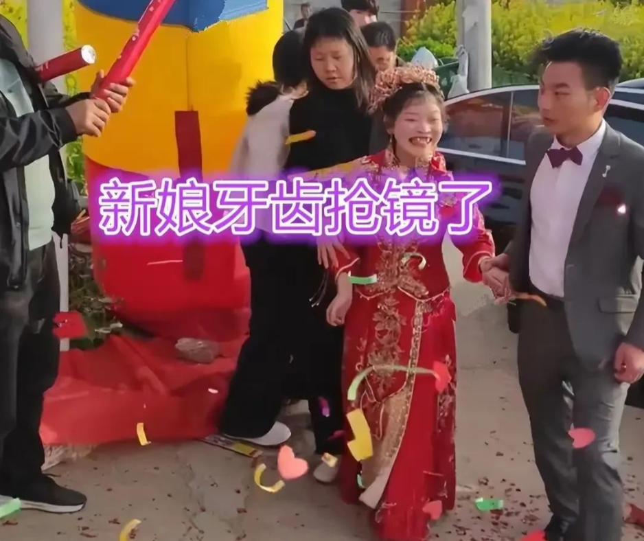 婚礼现场,红毯铺地,鞭炮齐鸣。新郎穿着笔挺的西装,新娘一袭白纱,两人手挽手走向舞台。如果只看背影,这不过是一场再普通不过的农村婚礼。可当镜头推近,新娘的五官成为焦点——龅牙、宽脸、小眼睛,网友的刻薄评价瞬间淹没了祝福的声音。
