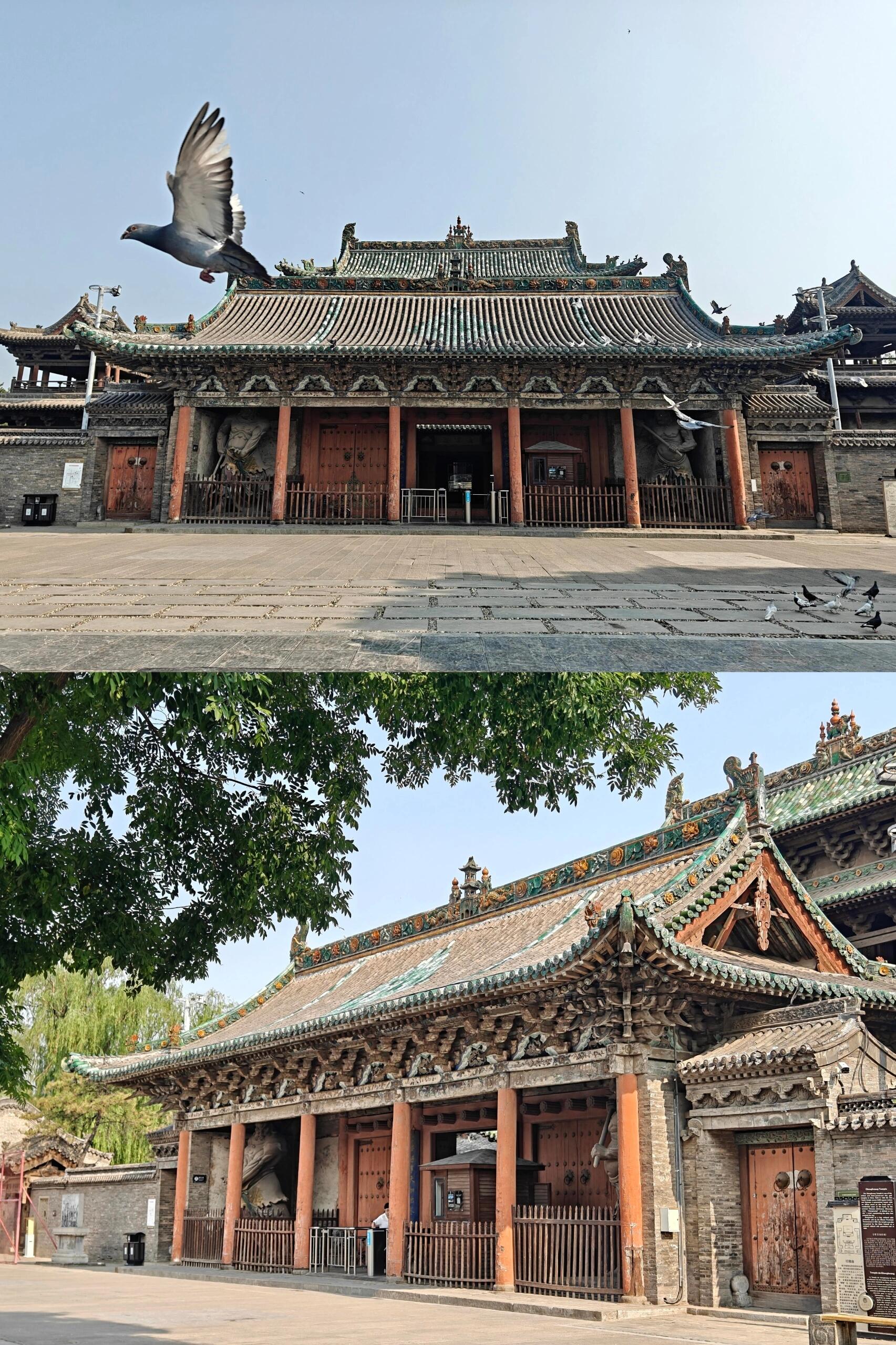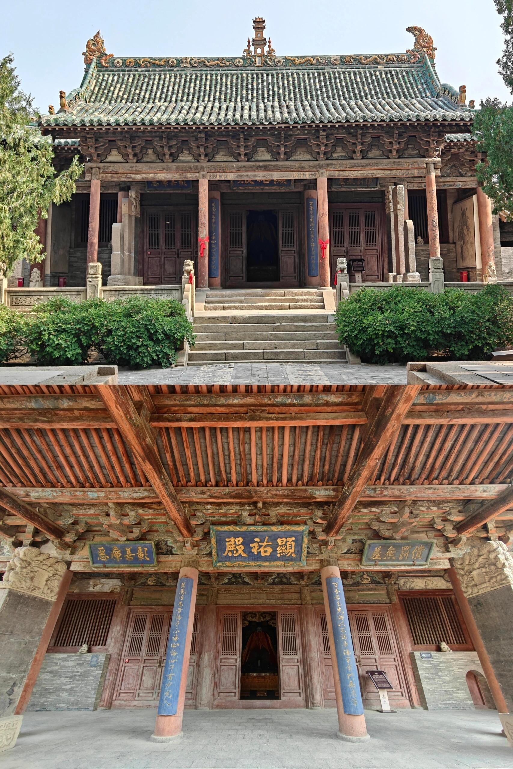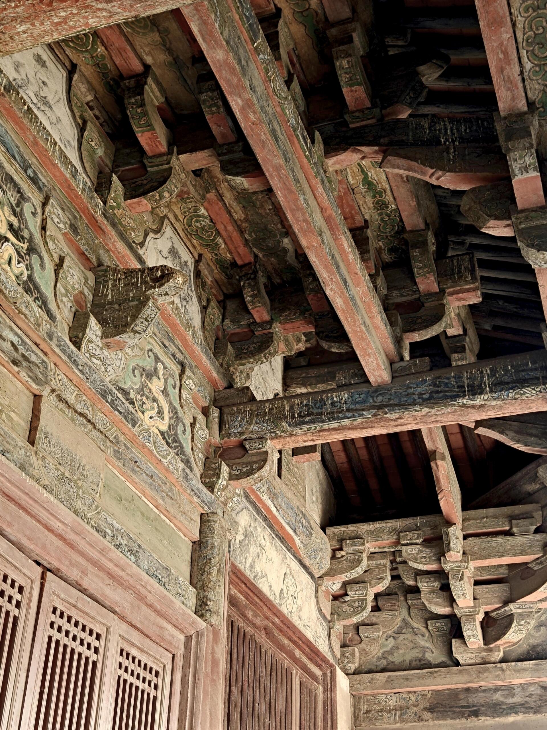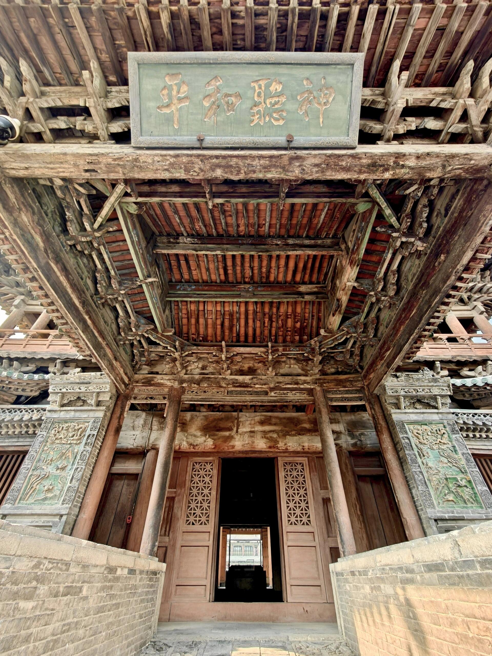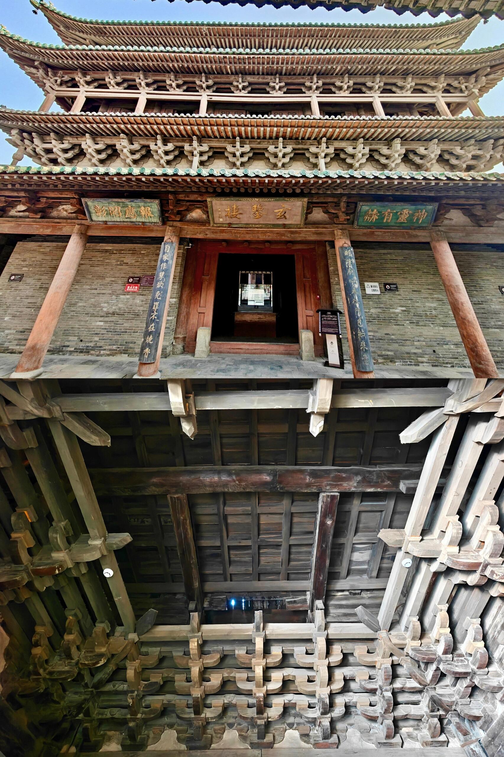 凑到近前才发现,玄鉴楼远比远观时更惊艳。面阔五间的楼体里藏着“玄机”,外部看是二层,内部却因暗层设计实为三层,中部楼梯盘旋而上,木扶手被岁月磨得光滑。最绝的是它与乐楼、戏台连在一起的设计:背面的乐楼面阔五间,单檐歇山顶下的柱网随转角变化,一层的平座供人凭栏;紧挨着的戏台只有一间面阔,单檐卷棚悬山顶的弧度柔和,台基中间留着缝隙,平时能过人,庙会时搭块木板就能开唱。更妙的是戏台与玄鉴楼二层檐的衔接,形成了“超级抱厦”的效果,两层屋檐错落相依,中间不足1米的缝隙里架着木梯,既不挡视线,又添了几分灵动。站在楼下看,飞檐如翼、斗拱如织,连木头上的木纹都仿佛在诉说匠人的用心,难怪有人说这组建筑是“雕琢到极致的艺术品”。
