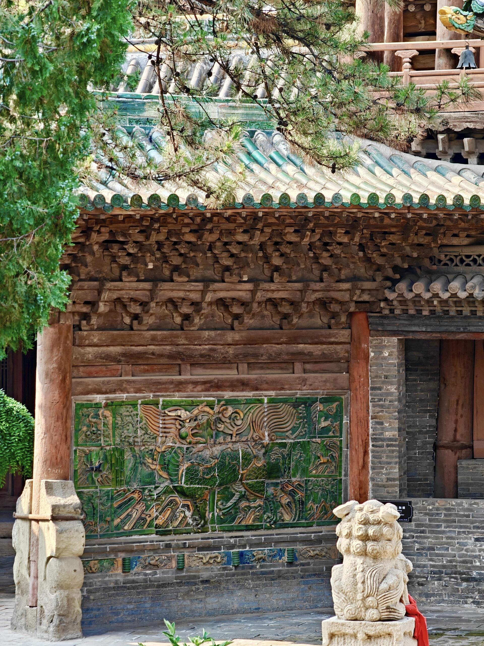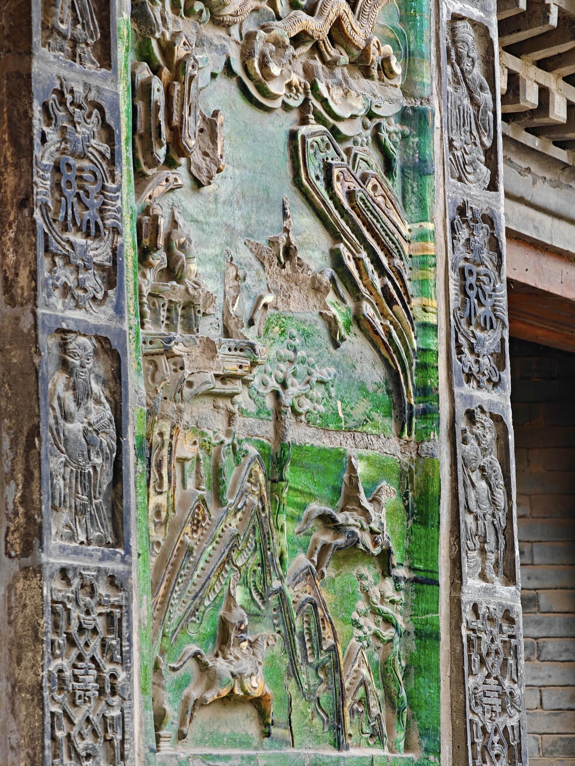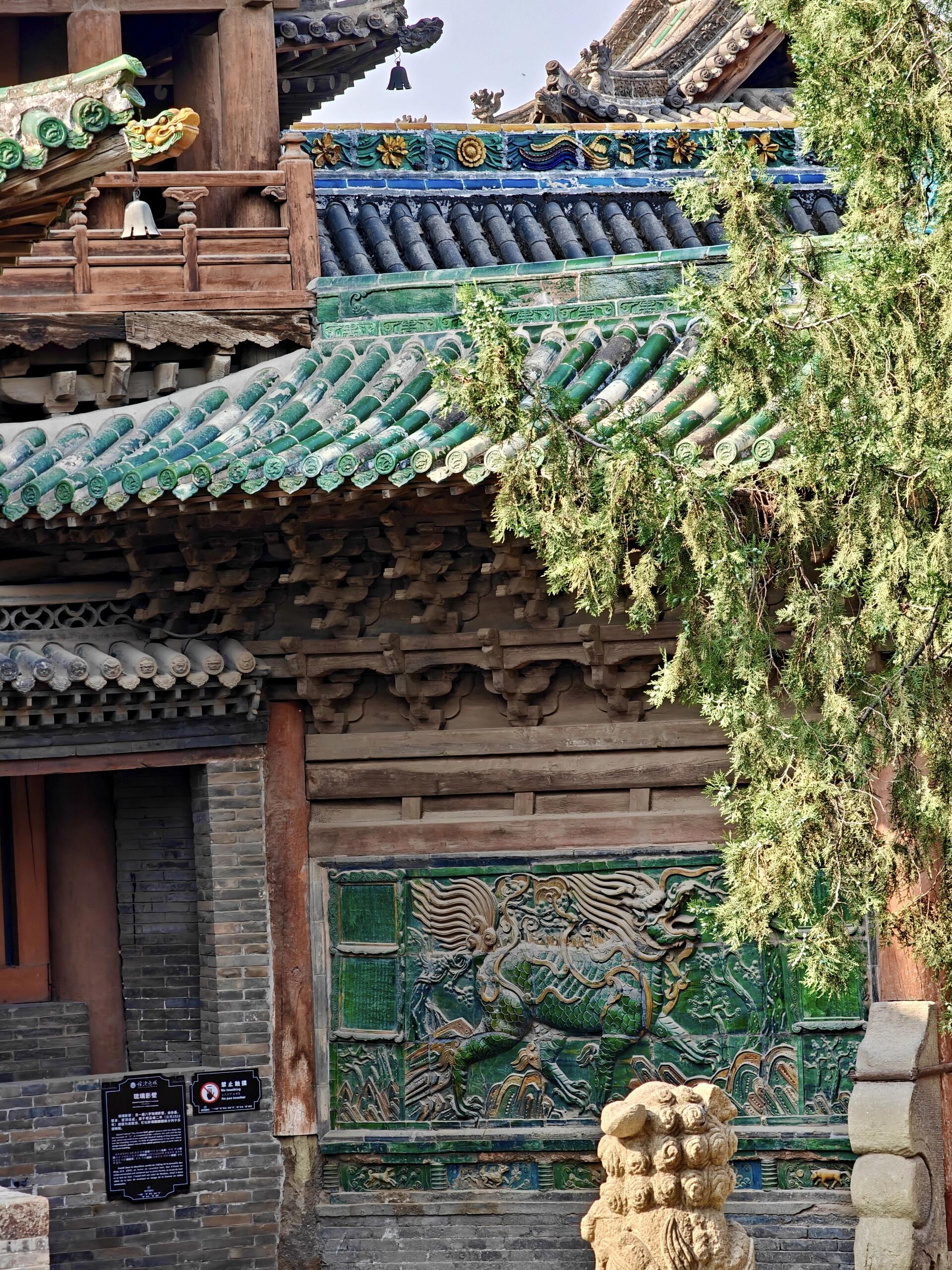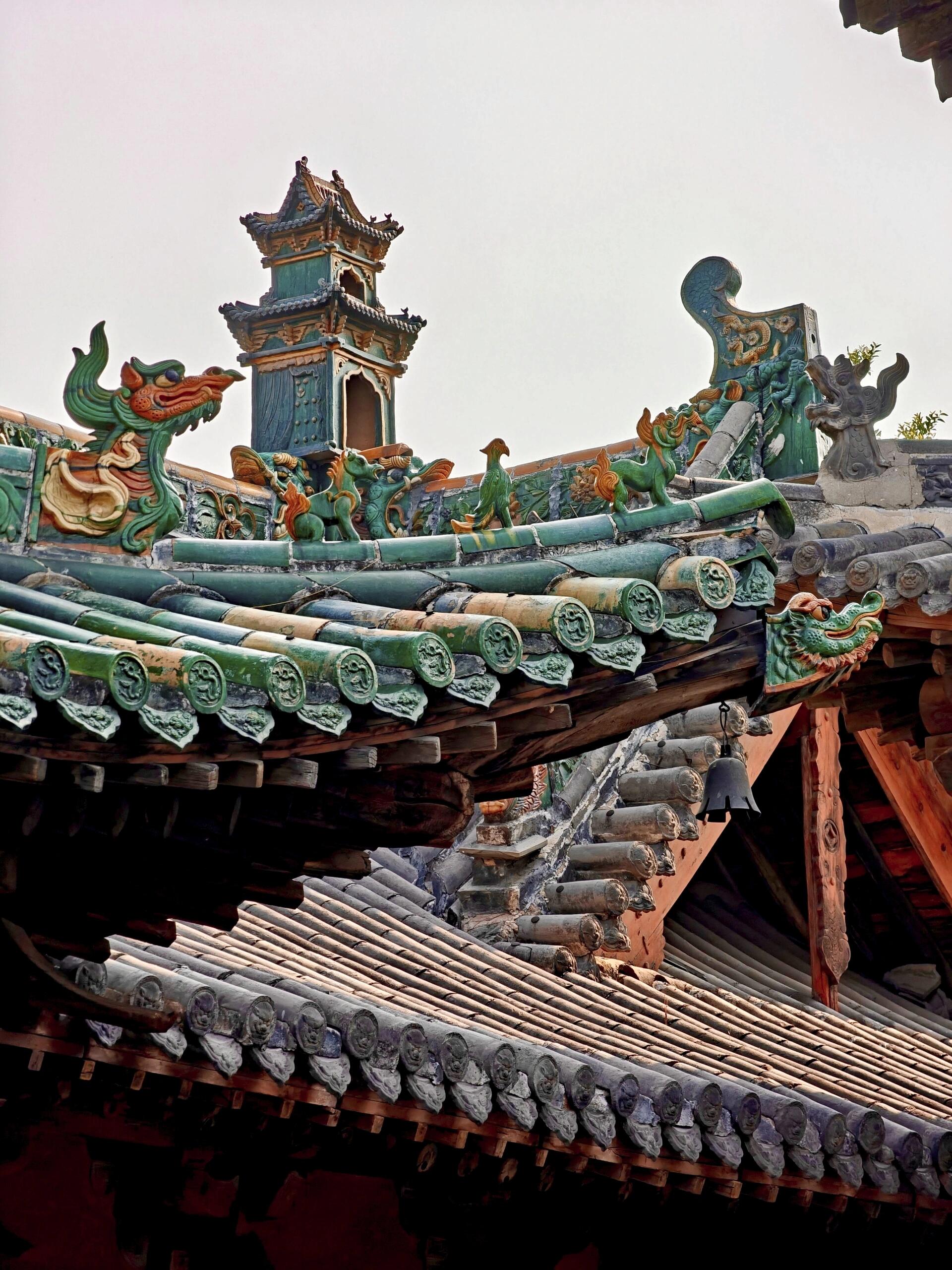 转到寝殿时,阳光正好从窗棂漏进来,在青砖地上投下细碎的光影。寝殿的规模比显佑殿小些,却多了几分雅致,檐角的琉璃装饰格外亮眼,尤其是脊上的“麒麟送子”图案,每一片琉璃都色泽饱满,麒麟的鳞片层层叠叠,连鬃毛都透着灵动。听打扫的阿姨说,这些琉璃都是明代烧制的,当时匠人要先捏出泥胎,入窑烧制时还要盯着火候,烧坏十片才能成一片,如今能完整留存下来,已是万幸。阿姨还指着寝殿后的院墙说,以前这里是城隍“休息”的地方,逢年过节会挂起帷幔,老百姓来祈福时,会隔着帷幔诉说心愿,现在虽不挂帷幔了,却仍有人来这里静静坐着,像是在与百年前的时光对话。