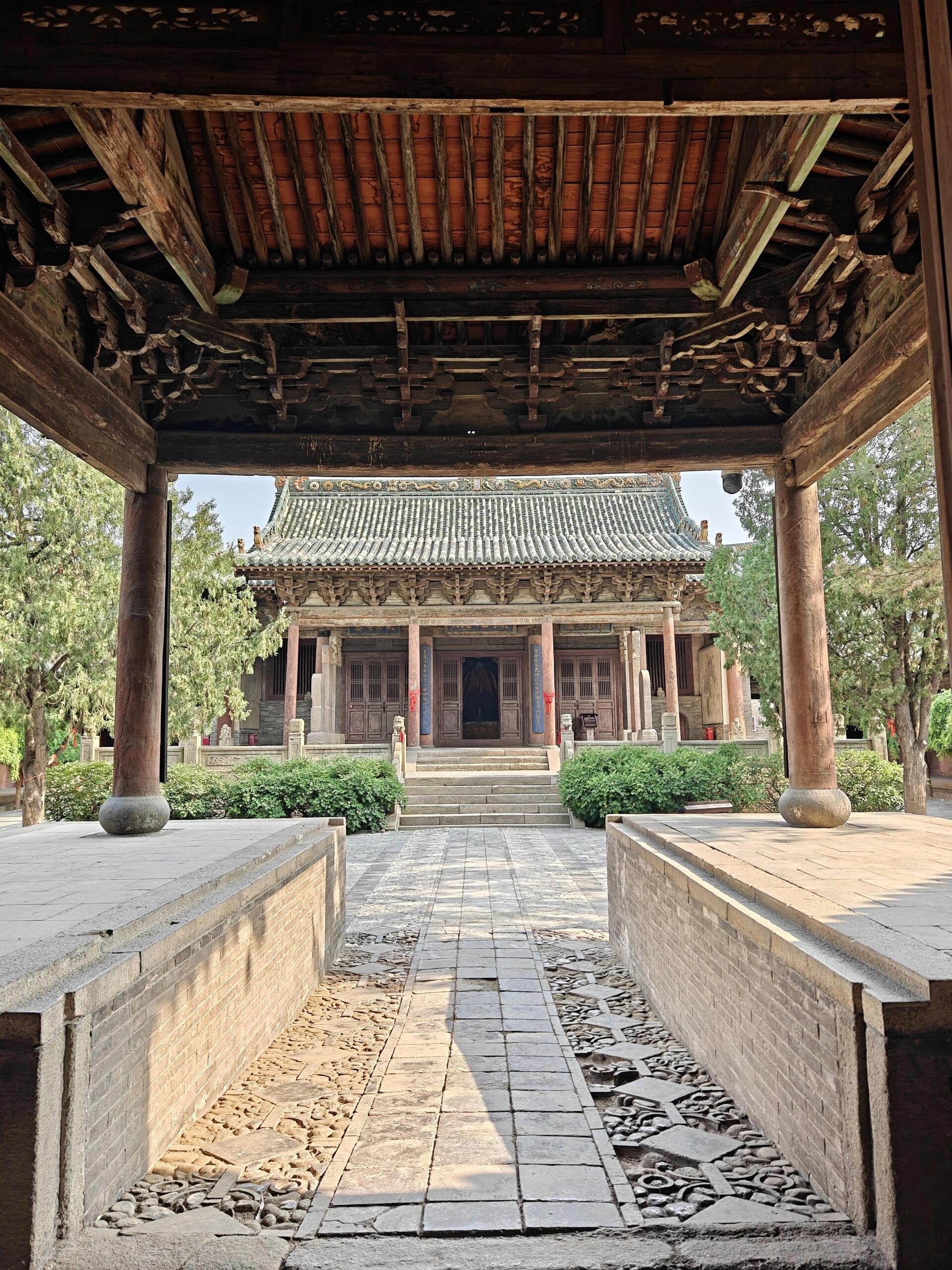 绕到玄鉴楼背后,三进院落的格局逐渐清晰。中轴线往北,显佑殿、寝殿依次排开,两侧的廊房、配殿对称分布,地砖按“人”字形铺就,踩上去能感受到细微的凹凸。显佑殿作为正殿,透着元代建筑的雄浑——面阔五间的殿宇前,三间卷棚式献殿与檐廊连成一体,共用一排檐柱,让整个空间显得格外开阔。檐下的斗拱最是讲究,单杪单下昂五铺作的形制,补间铺用的真昂斜挑而上,昂尾直抵下平槫,不用一根钉子却稳如磐石。我踮起脚往殿内看,四根内柱撑起高敞的空间,柱身的木纹像水波般蔓延,凑近还能闻到淡淡的木香,献殿里立着的六通碑碣,碑文字迹虽有些模糊,却依稀能读出明清时重修的故事。