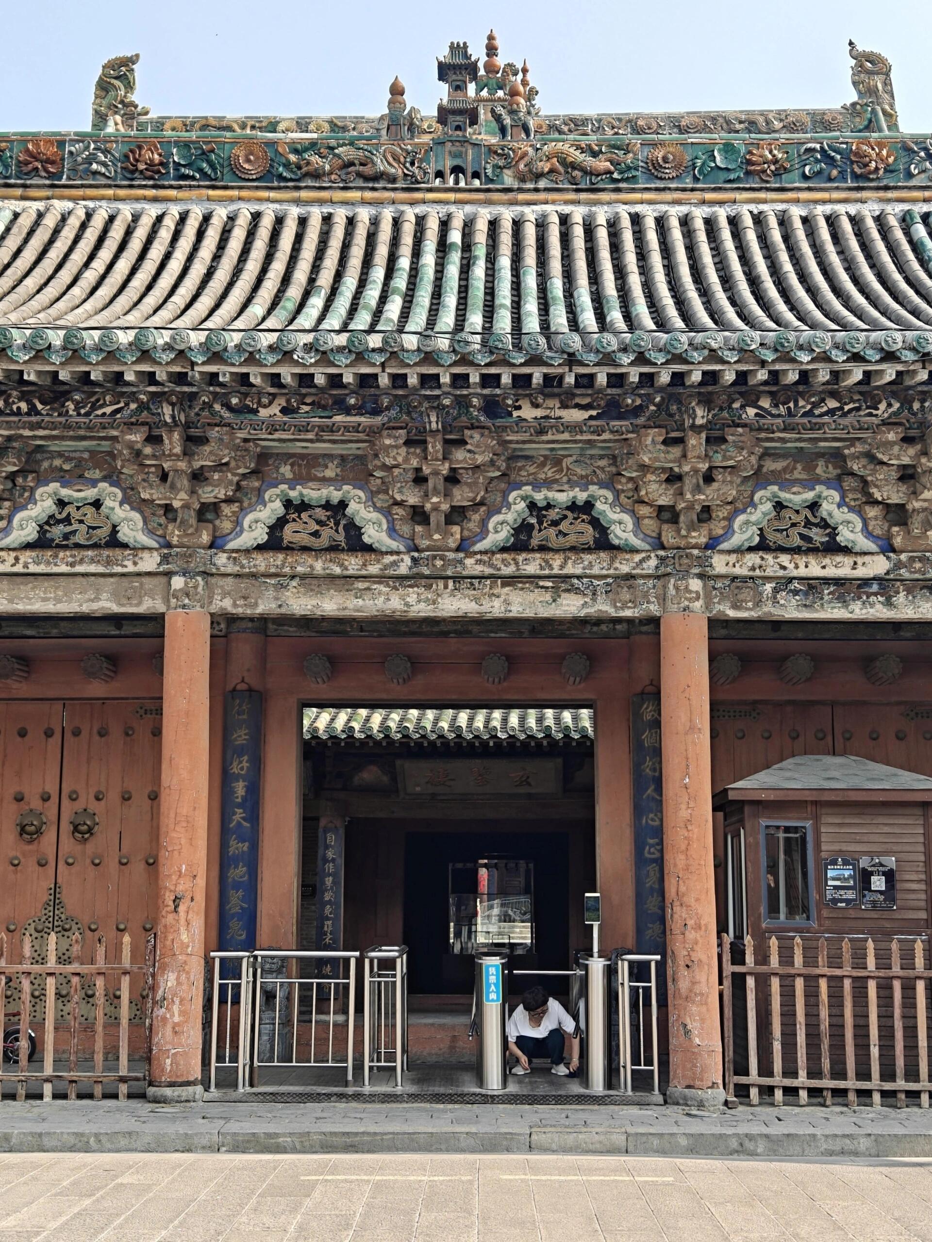 国庆自驾山西,在榆次老城的街巷里兜兜转转,导航提示“已到达目的地”时,眼前那座飞檐叠翠的建筑群还是让我愣了愣——朱红山门嵌着铜钉,门楣上“城隍庙”三个字透着沉郁的古意,旁边石碑刻着“国保四级”的标识,78元的联票价格在山西古建中不算低,却让我生出几分“倒要看看值不值”的期待。原以为1小时就能逛完的地方,没成想一脚踏进去,就被那座叫玄鉴楼的楼阁勾住了脚步,连带着三进院落里的斗拱、琉璃、碑碣,都成了舍不得错过的惊喜。