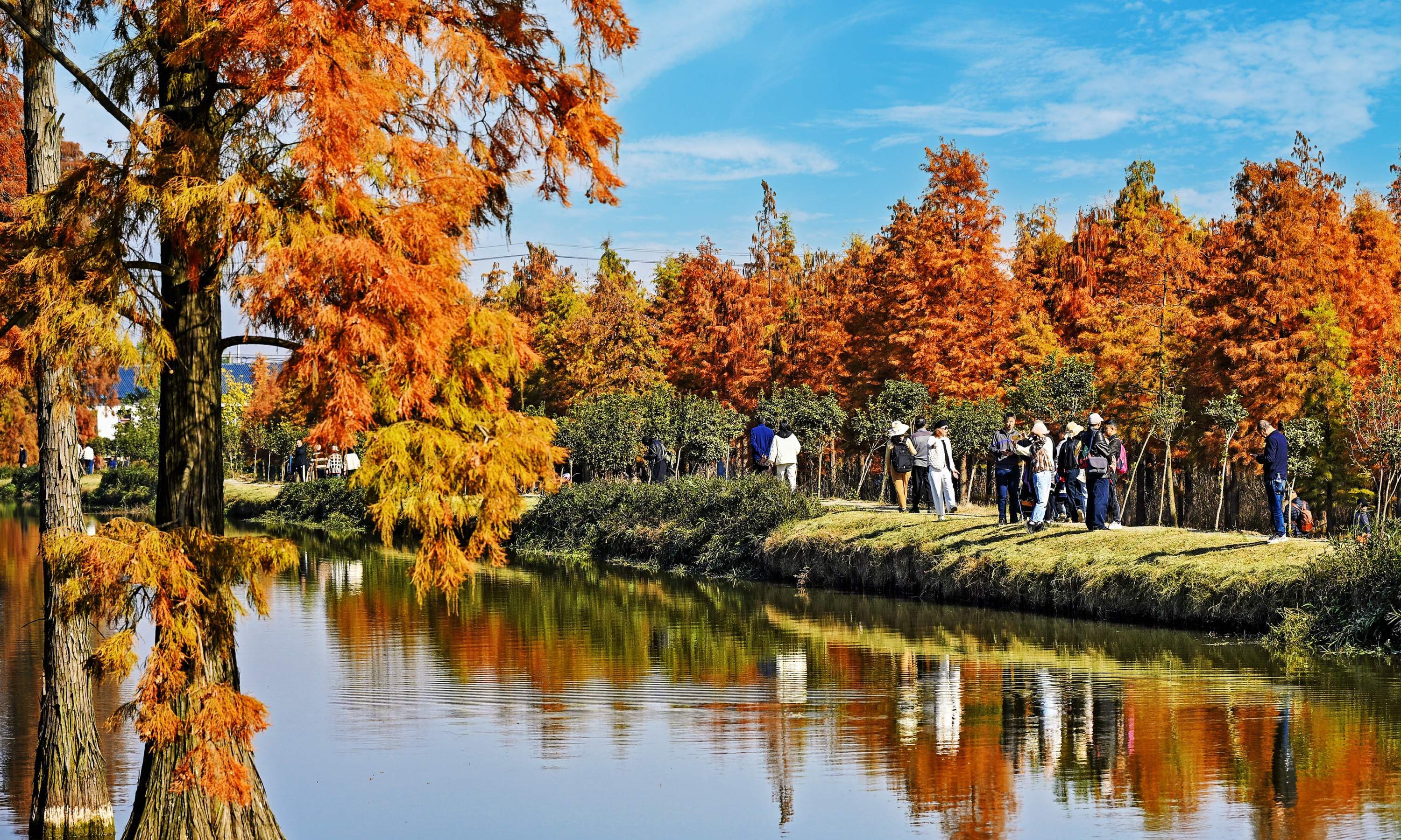 武汉市新洲区涨渡湖湿地迎来一年中最富诗意的时候:层层叠叠的红叶将水上森林染成绯红与橙黄交织的画卷,吸引众多市民游客前来感受“树在水中长,鸟在林中飞”的美景。
