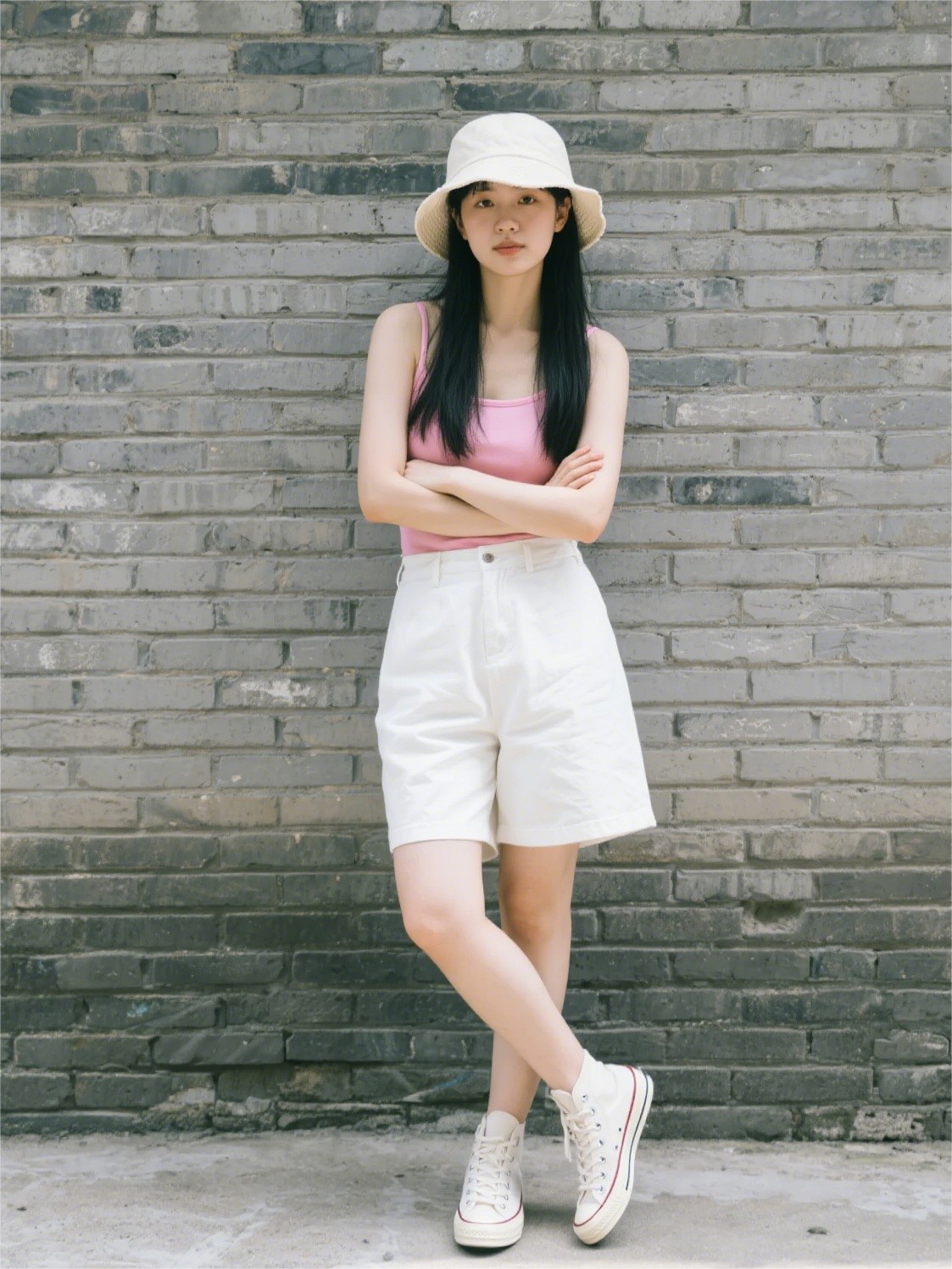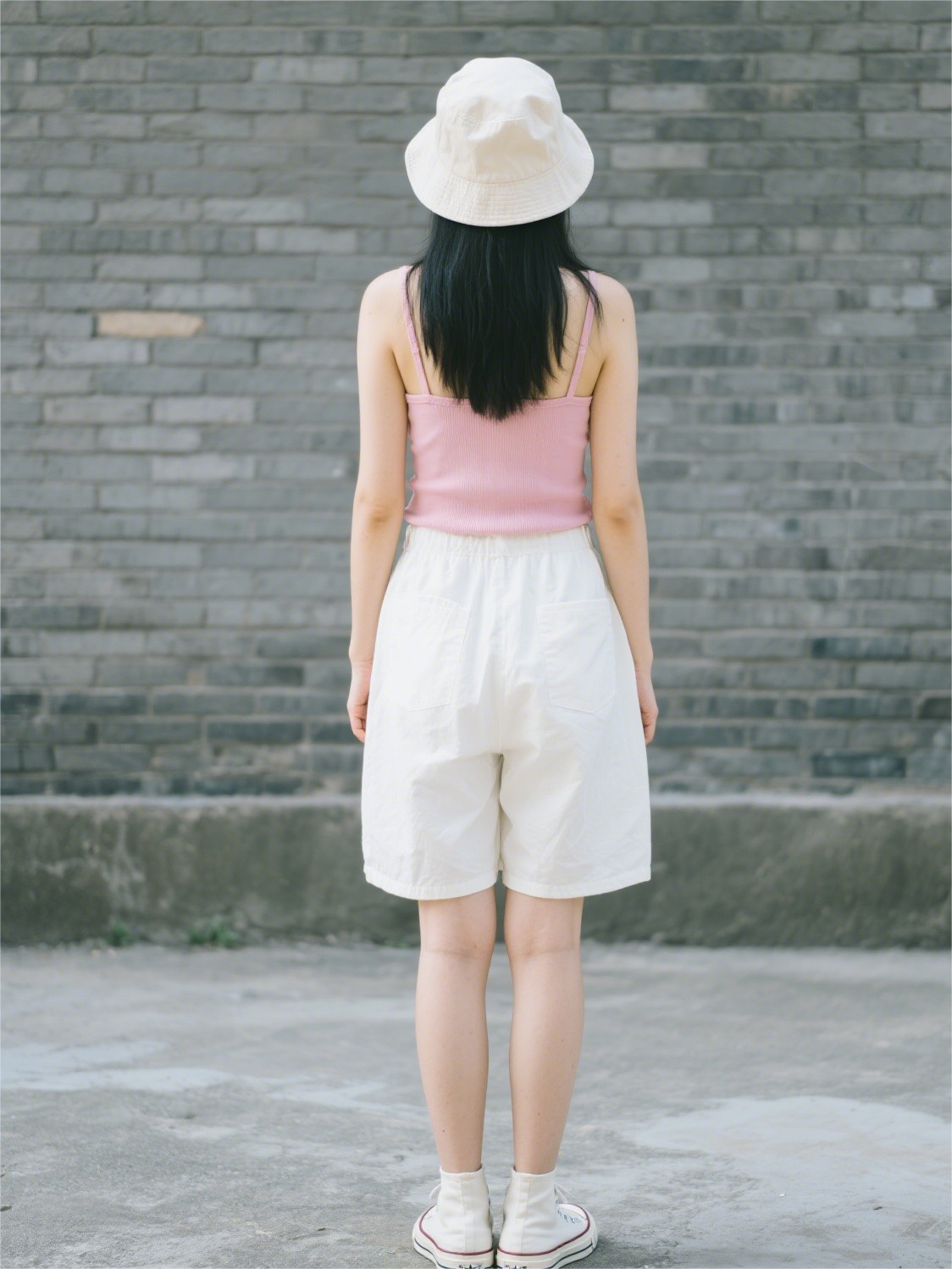 今天这套Look,用最简单的色彩组合与基础单品,演绎出最清爽的夏日气质穿搭。粉色吊带背心+白色五分裤+白色渔夫帽+帆布鞋,干净、利落、不造作,传递出一种恰到好处的松弛感,既不失少女感,又不显幼稚。