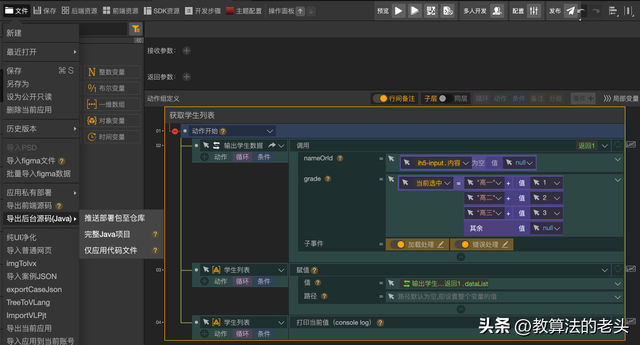 图形化编程语言:通过数据流模型实现程序逻辑的可视化表达,支持条件判断、循环迭代等控制结构,逻辑转换准确率达 98.2%(基于 5000 + 业务场景测试)。其底层采用基于状态机的事件驱动架构,能够将可视化逻辑精准映射为可执行代码,避免了传统低代码平台常见的逻辑转换误差问题。全栈 IDE:覆盖前端界面设计、业务逻辑编排、数据存储到后端服务开发的全流程,提供项目资源管理、调试运行、版本控制等完整工具链支持。开发体验与 VS Code 等传统 IDE 高度相似,支持插件扩展机制,可集成第三方工具链(如 Postman 接口测试、SonarQube 代码质量分析),形成完整的开发闭环。这种定位使其既不同于封闭式低代码平台,也区别于单纯的开源框架,开创了可视化开发的全新范式。