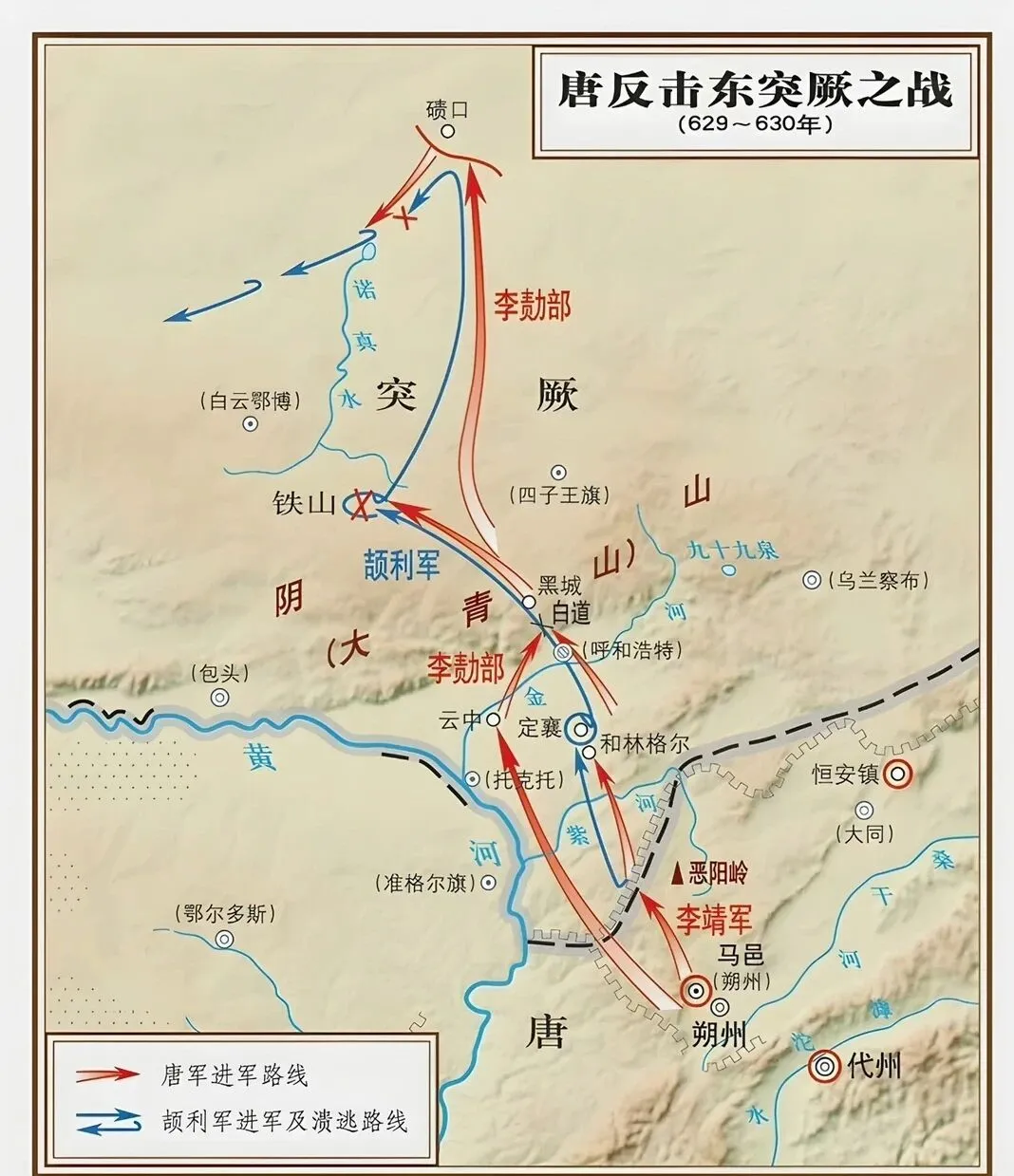 玄武门之变后,李世民刚刚登基不久,东突厥颉利可汗就率军侵犯,兵锋直指长安。李世民逼不得已签订了“渭水之盟”,搬空长安府库才让东突厥退兵。这让李世民这位马背上的皇帝深以为耻,仅仅是三年后,贞观三年(公元629年),在东突厥陷入雪灾、内乱之际,李世民果断派遣李靖、徐世勣共六路大军反击突厥。