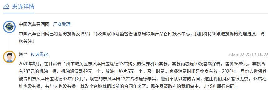 坑位一:4S店“跑路”成风,售后权益一夜归零在中国汽车召回网上有用户投诉,“2020年买的10次保养套餐,用了不到一半,4S店突然就倒闭了。”甘肃兰州的赵先生至今仍感到愤怒。他曾在当地东风本田宝瑞德4S店花费3688元购买了一份“终身有效”的基础保养套餐,然而2026年1月,当他再次前往保养时,却发现店面已改头换面,新接手的德泰昌4S店以“不是我们卖的”为由,拒绝履行原合同。