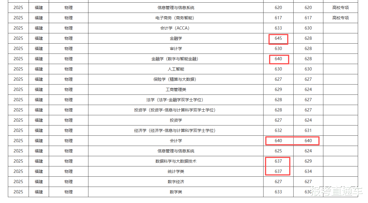 咱们先来看看福建历史类的小伙伴们。在文科生眼里,上财的金融学和会计学简直就是“殿堂级”的存在,录取最高分分别飙到了638分和632分。这个分数是什么概念?它意味着你几乎要在文史哲的博弈中杀进全省最顶尖的那一小撮人里,才有资格在上财的“红瓦黑窗”下讨论复利和审计。这不仅是对智商的考验,更是对“稳”字经的极致要求。