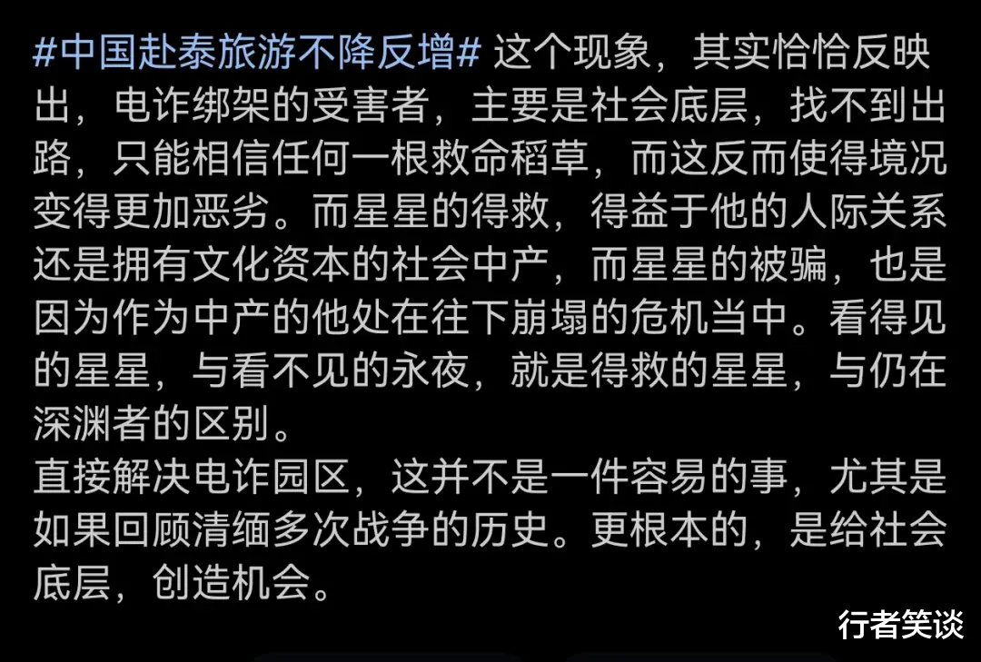有个网友的解密分析,让我久久不能平静:这些电诈陷阱的目标,从来就不是那些能随便去泰国度假的人。他们盯上的是社会底层,那些走投无路的人。因为这些人,才会对高薪工作抱有不切实际的幻想。