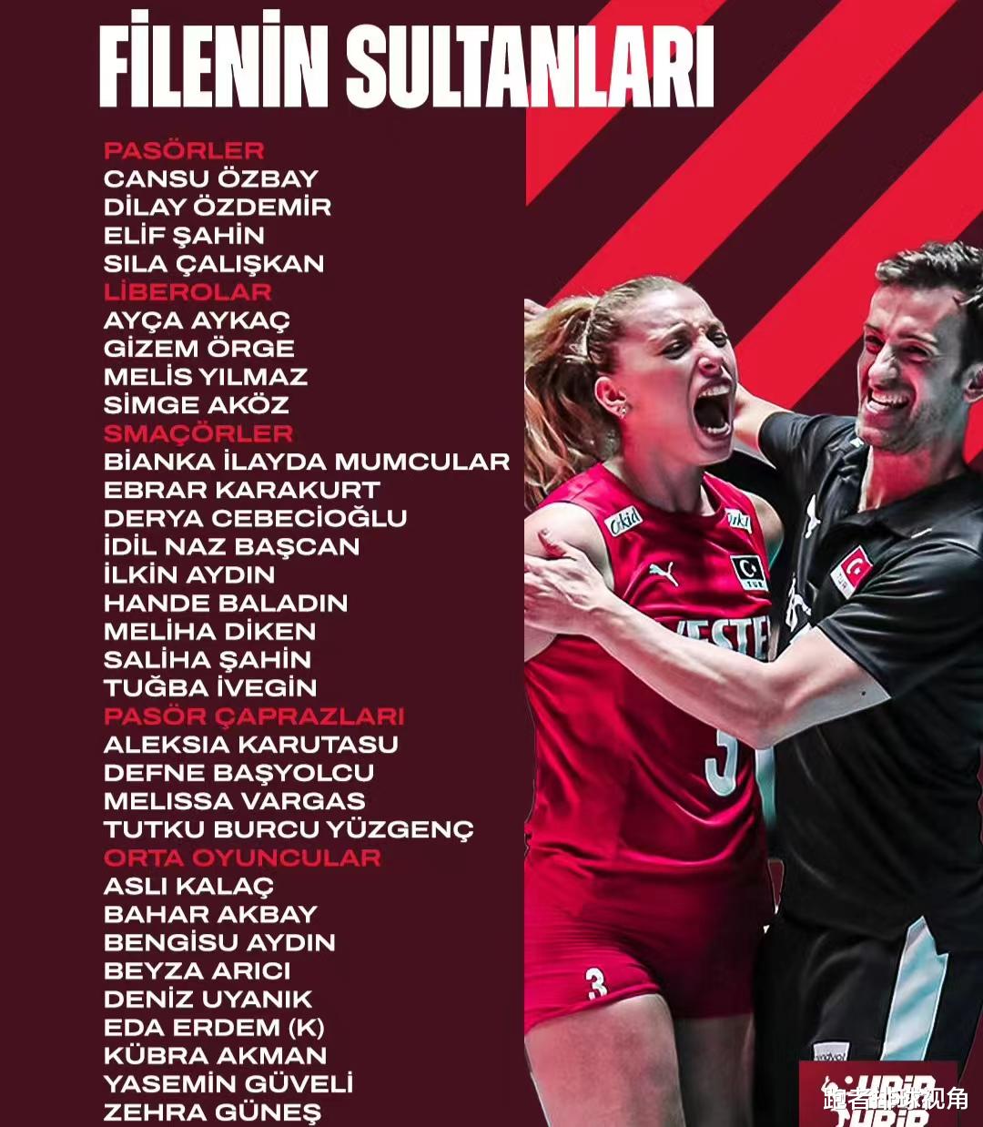 入选土耳其女排30人名单的球员分别是:二传奥兹巴伊、E沙辛、西拉、迪莱,主攻梅里哈、伊尔金、S沙辛、巴拉丁、图格巴、德尔亚、穆库拉、卡拉库尔特、巴斯坎、接应瓦尔加斯、卡鲁塔苏、尤兹根奇,巴约库尔,副攻艾达、泽赫拉、阿斯利、居维利、阿克曼、贝伊扎、本吉苏、阿克巴依、代尼兹,自由人阿伊卡奇、奥格,阿克兹、梅利斯。很显然土耳其女排的这份名单还是以瓦尔加斯主打,不过在天津女排受伤以后,最近一段时间瓦尔加斯的表现不尽人意。