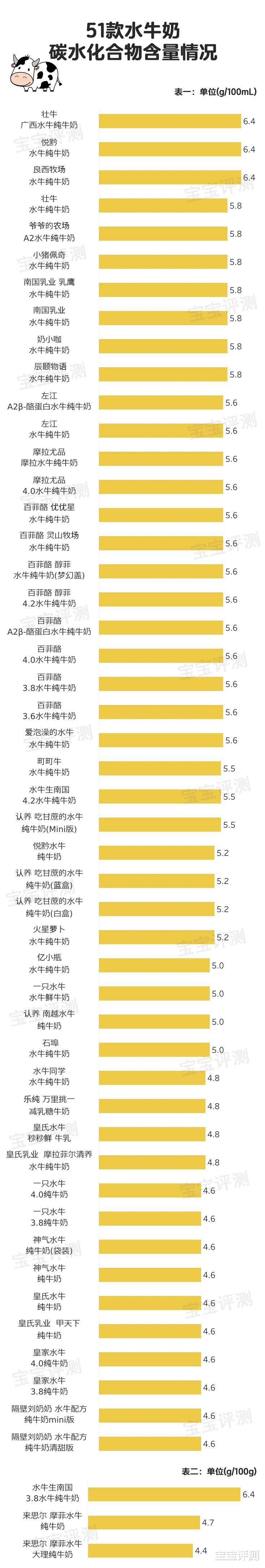 1、51款水牛奶的碳水化合物含量在4.4—6.4 g/100mL(100g)之间。