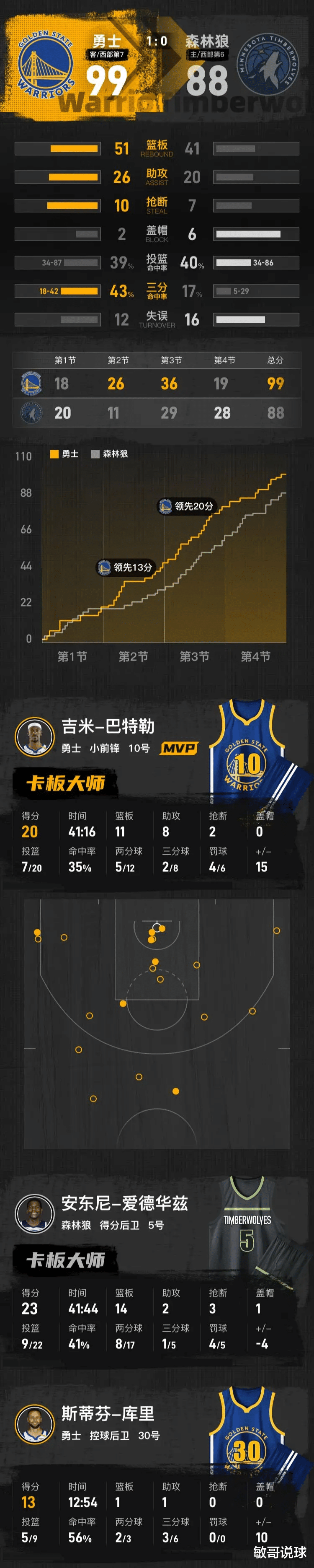 五、数据透视与历史启示三分球决定胜负:勇士三分 22 投 9 中,森林狼 23 投 5 中,这 12 分的差距直接左右比赛结果。