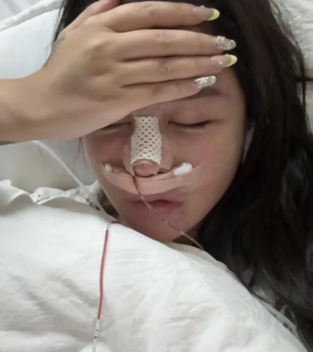 网红们都有一个共同点就是随时记录自己的状态,韩安冉躺在病床上还得换着角度自拍,把手放在额头上凹造型,美甲特别抢镜,鼻子上面贴着纱布,还有延伸到外面的细管,上面还有流血的痕迹。