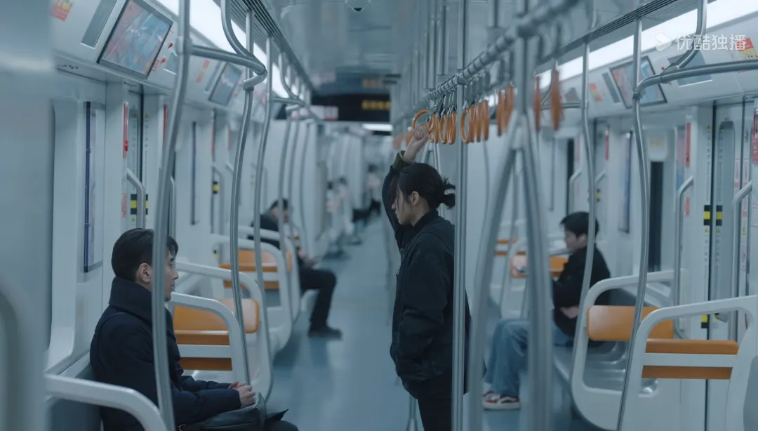 但从另一个角度看,这又是一幅有些心酸的画面:末班地铁的车厢,衣着朴素、面容憔悴的男女,一坐一站,维持着不远不近的社交距离。