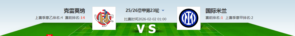 本场比赛是意甲第23轮的一场较量,由主场的克雷莫纳迎战国米。克雷莫纳目前取得了5胜8平9负的成绩,积23分排在积分榜第13位;国米目前取得了17胜1平4负的成绩,积52分排在积分榜榜首。