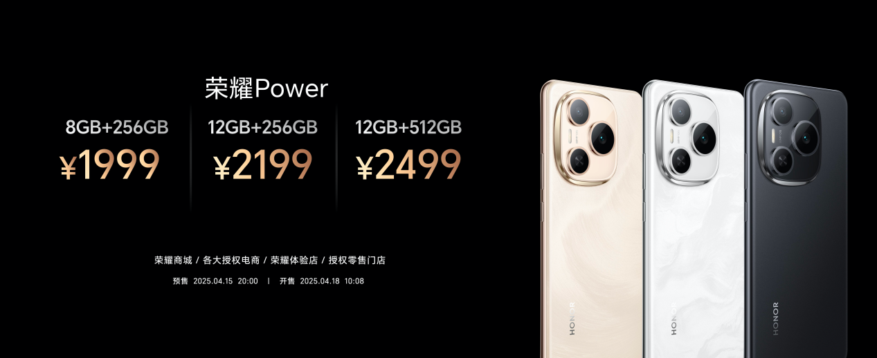 荣耀Power遵循时尚大方的科技美学设计理念,提供“雪原白”、“沙漠金”和“幻夜黑”三种配色,以及8GB+256GB、12GB+256GB、12GB+512GB三个容量版本,国补后售价分别为1699.15元、1869.15元和2124.15元。荣耀Power已于2025年4月15日全面开启预售,并将于4月18日10:08在荣耀商城、各大授权电商、荣耀体验店和授权零售门店正式开售。