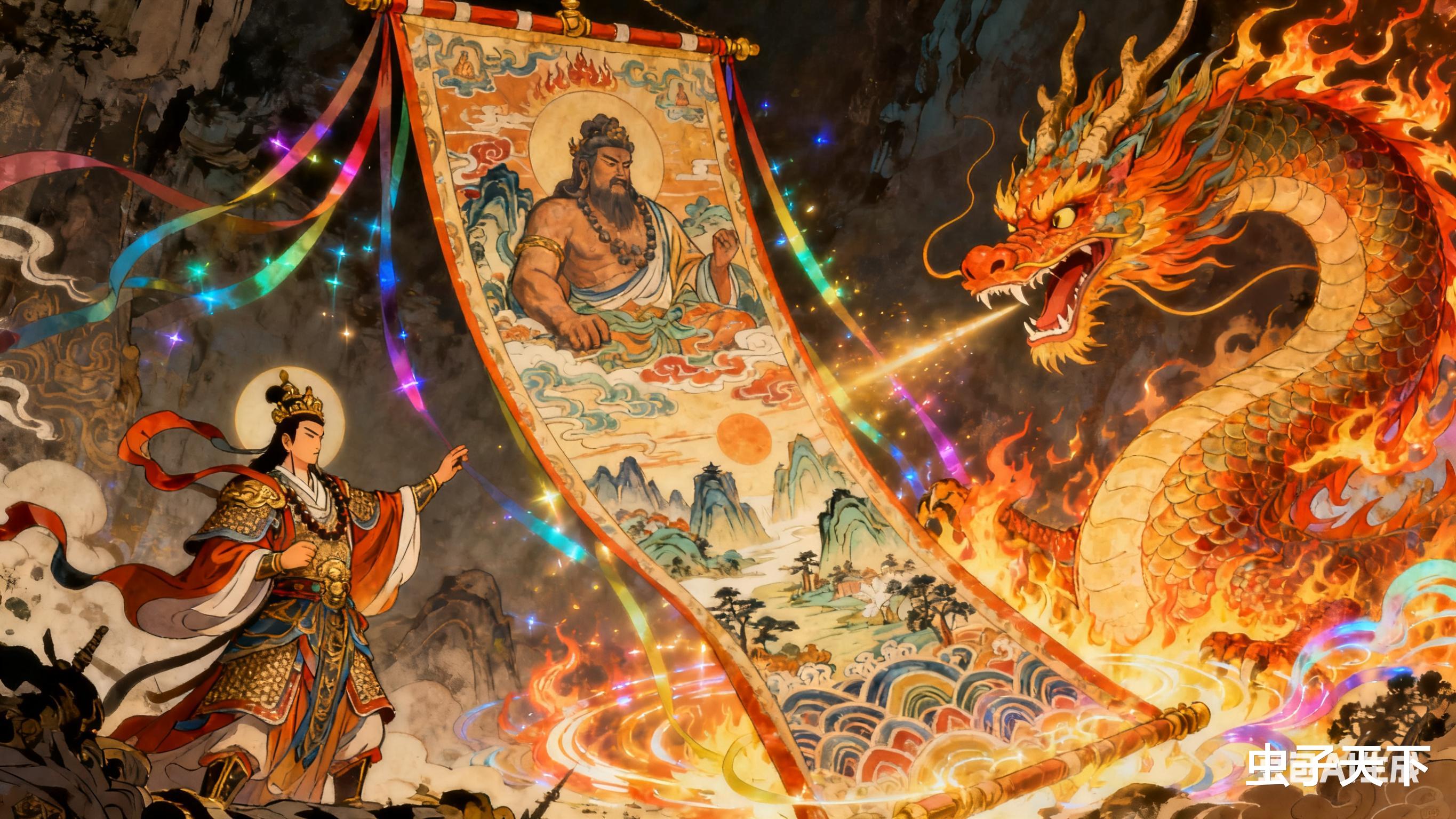 天尊抬手展动盘古幡,幡面瞬间浮现盘古开天辟地的图景,都天神煞之气扑面而来,五色毫光将火龙拦在半空。