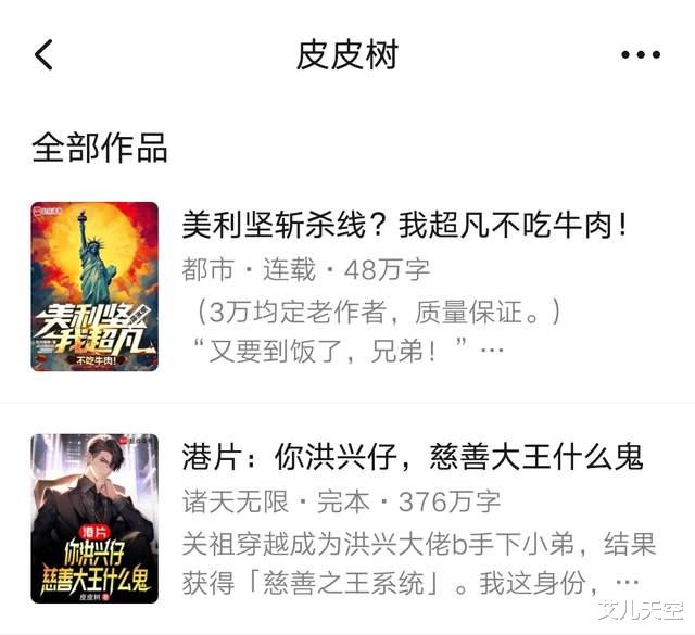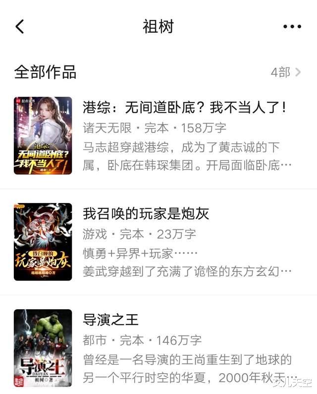 皮皮树本身也是祖树的马甲,开马甲后的作品《港片:你洪兴仔,慈善大王什么鬼》三万订以上创造了自己的最好成绩。只是后来开书不太顺利,换马甲去写美国斩杀线题材了,看着也有四五千均的成绩。