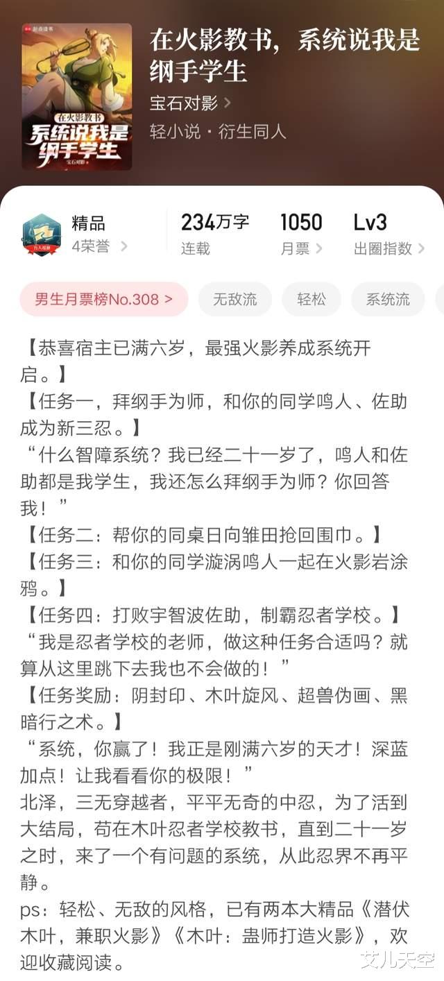 1、《在火影教书,系统说我是纲手学生》完结
