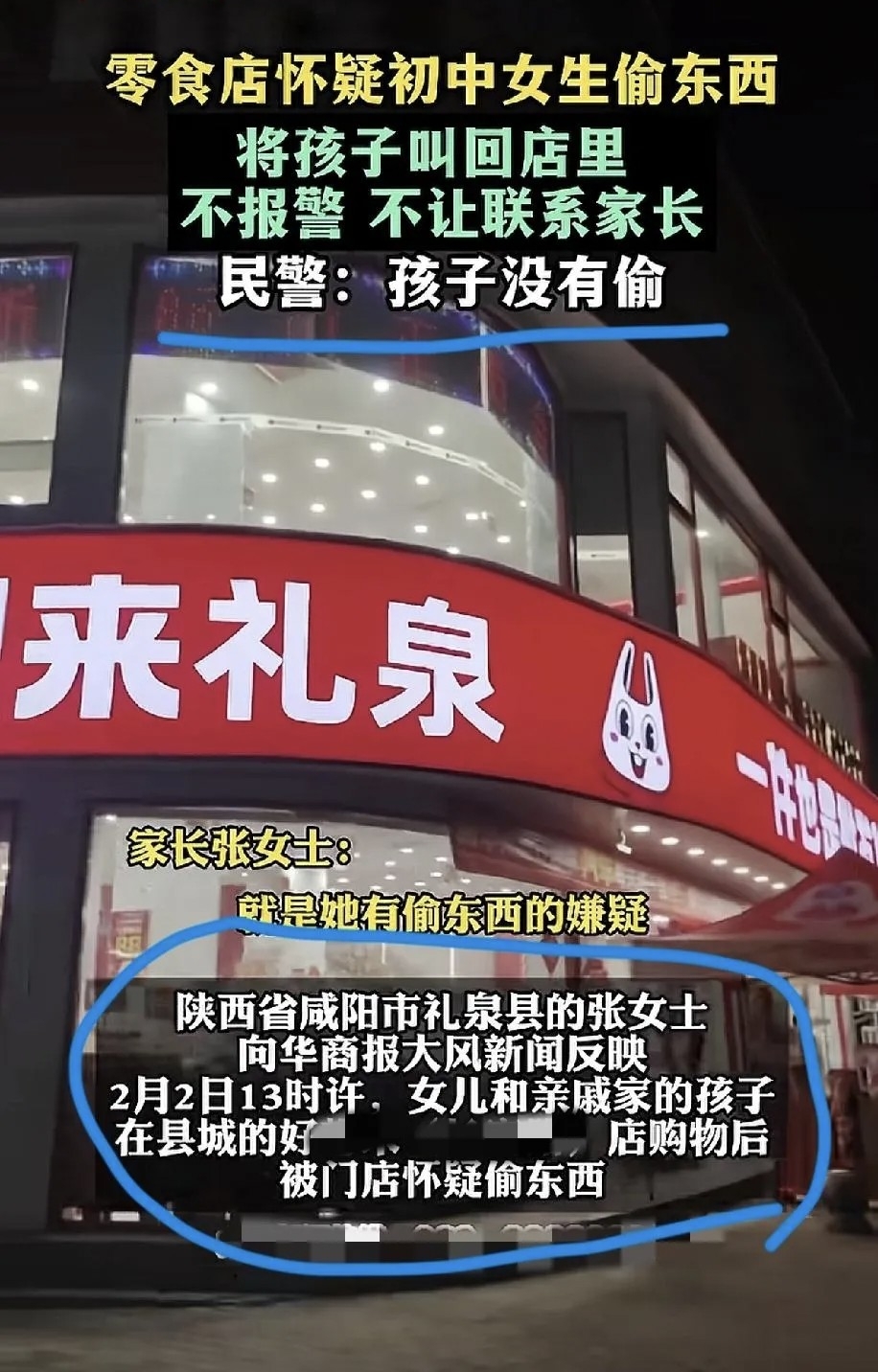 2月2日,陕西礼泉,一初中女生买完零食刚走出十几米,就被店员强行扣回店内,无端怀疑偷窃。