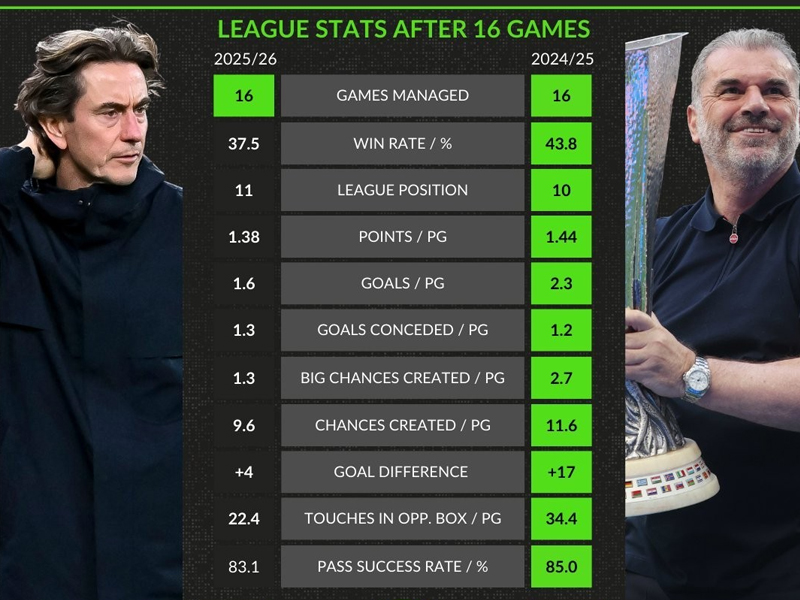 稍早开赛的热刺令人失望,客场惨败诺丁汉森林,虽然排名没有变化,但是距离前面的球队越来越远。两个月前,热刺排在英超第三名,距离榜首阿森纳只有2分,如今落后多达14分。统计表明,同样是16轮,弗兰克所有数据均比上赛季的波斯特科格鲁更差,难道又直奔保级区而去?