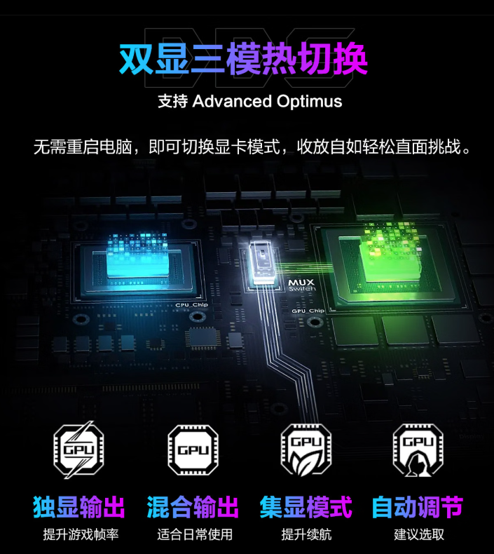 显卡方面,内置NVIDIA GeForce RTX 5070 Ti 笔记本电脑 GPU,140W 功耗释放,采用 Blackwell 架构打造,配备 12GB GDDR7 大显存,支持 DLSS 4 多帧生成技术,可有效提升游戏帧率,保障画面流畅度。此外,ROG 魔霸 9 还支持双显三模热切换功能,无需重启即可切换独显、集显、混合三种模式,可根据使用需求灵活平衡性能与续航。