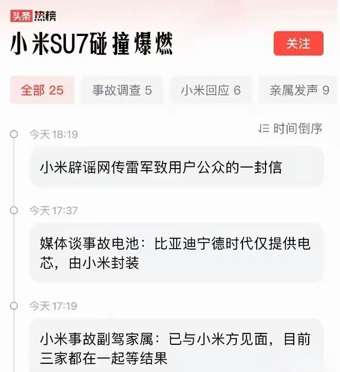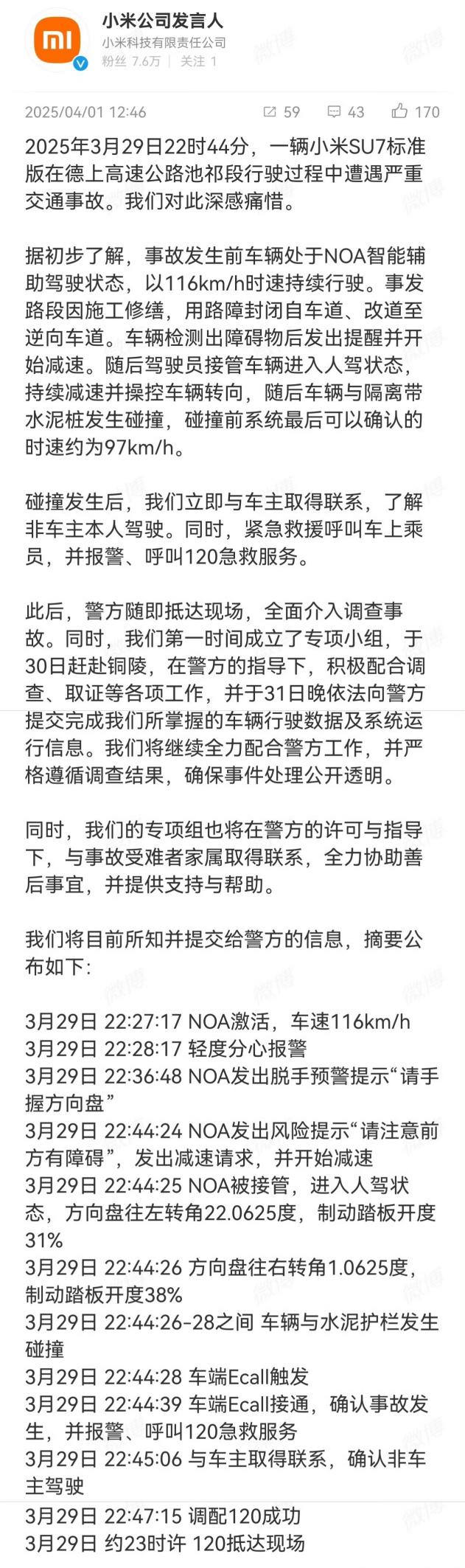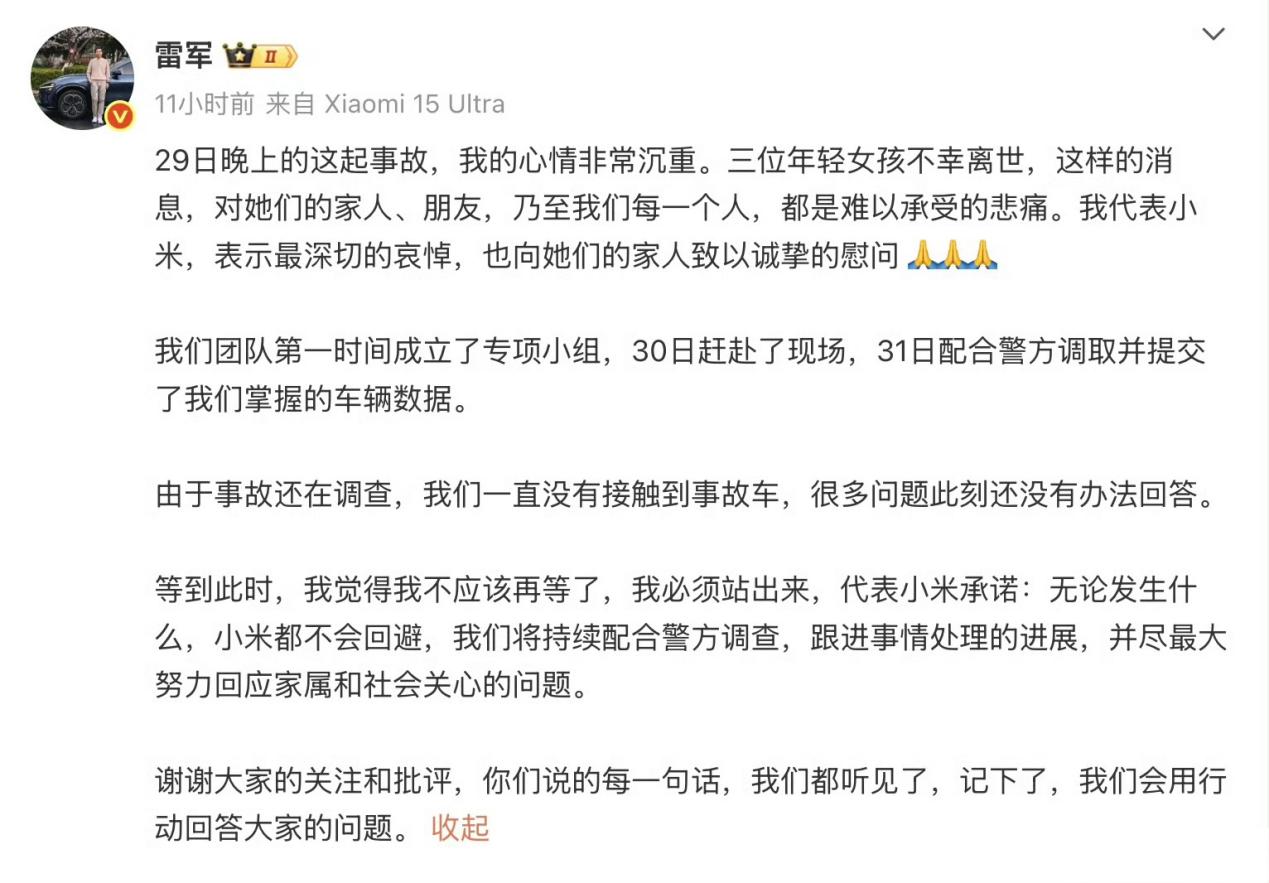 事情还得从那场惨烈的事故说起。一辆小米 SU7 在行驶途中突发意外,酿成了令人痛心的悲剧。这本就是个让人揪心的意外,可随着事件的发酵,越来越多的细节和争议点被抛了出来,大众的关注点也逐渐从单纯的事故本身,转移到了后续各方的反应和处理上。小米公司的声明发布后,遇难者母亲王女士站了出来,在微博上发声,言辞中满是对小米公司的质疑。她表示,从事故发生到自己发文那一刻,小米方面既没有人联系过她,也没有送来哪怕一个慰问电话,仅仅是把事故车辆拉到北京做鉴定。这与小米创办人雷军所说的 “小米方面一直没有接触到事故车”,简直是针尖对麦芒,矛盾冲突瞬间被激化,网友们也纷纷化身 “福尔摩斯”,开始对事件各抒己见,舆论的矛头一下子就指向了小米公司。