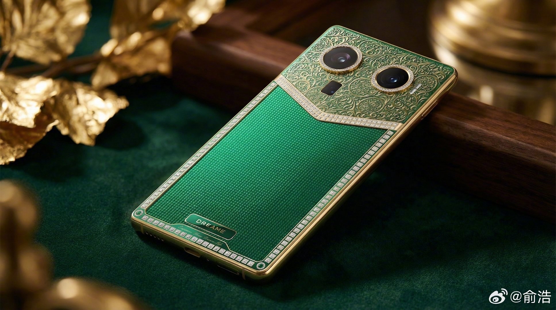 图片显示,追觅手机并不像传统旗舰手机一样,追求极简设计,而是采用奢华造型,机身后壳采用与劳力士“绿水鬼”相似的绿色调,摄像头区域有浮雕花卉纹理,下半部分则有巴黎饰钉纹理,四周镶嵌闪钻,整体设计风格与8848钛金手机类似。