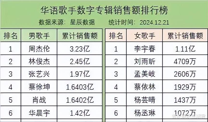 周杰伦这个名字,提起来就让人觉得熟悉,他的歌陪伴了多少人的青春啊。3.23亿的销售额,这数字看着都让人眼晕,不愧是天王级别的存在。他的歌总是能戳中人心,有时候听着听着就想哭,也不知道为啥。可能是因为他的歌词写得太好了吧,又或者是他的曲调太动人了。不过话说回来,周杰伦这么多年了,一直都是顶流,也不知道他是怎么保持的。可能是因为他一直在创新吧,每次出新歌都能给人惊喜。但是也有人说他的歌越来越难懂了,不像以前那么朗朗上口了。这个嘛,见仁见智吧,反正我觉得只要好听就行。周杰伦的歌总是能让人想起很多事情,比如第一次恋爱,比如高考前的紧张,比如毕业时的不舍。这些回忆都被他的歌串联起来了,成为了我们共同的记忆。不过话说回来,现在的年轻人还喜欢周杰伦吗我看现在的流行歌手好像都变了样子,不知道周杰伦还能不能吸引到新一代的粉丝。