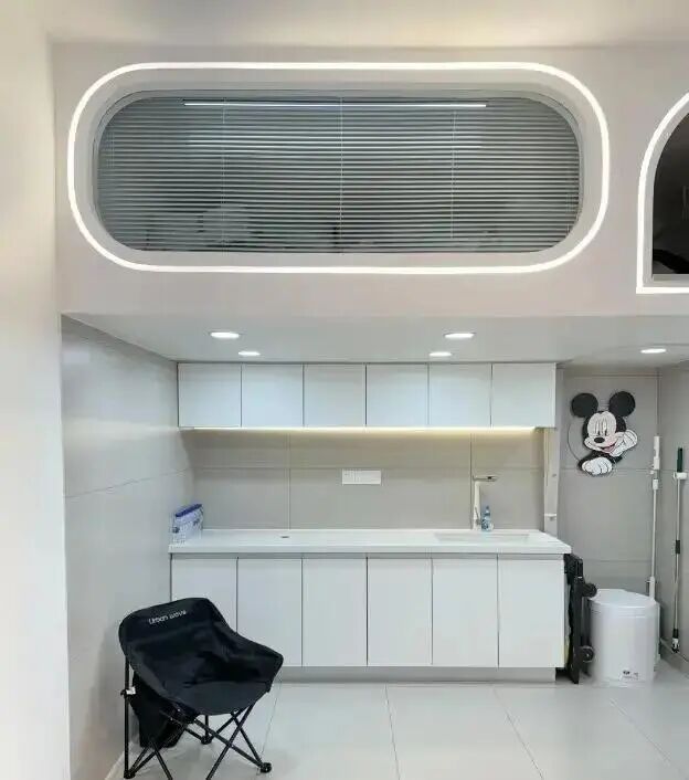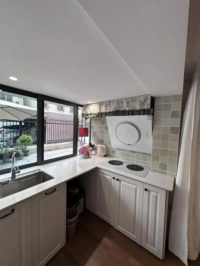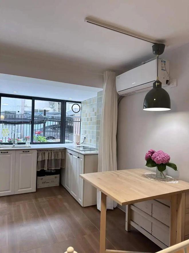 因车库的原始层高很高,所以就做了阁层设计,在上面加了一层,做成了卧室,下层的空间做了一趟柜子,既可以当橱柜,还可以当餐边柜,超级方便。