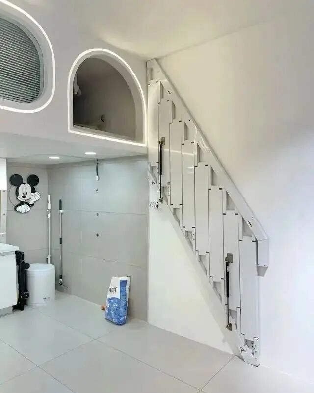 并且,为了不占地方,还做了折叠的楼梯,不用时贴墙收纳,超级省地方!
